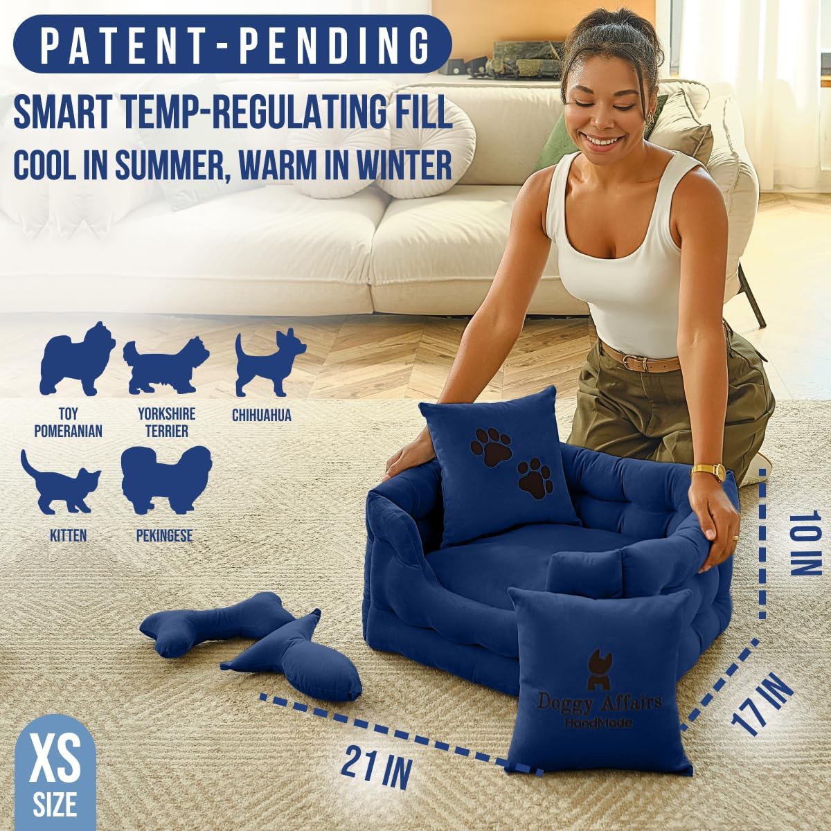 - JOINT SUPPORT COMFORT & TEMP REGULATION: Premium cushioning supports joints, hips, and growing bones, while smart fill keeps her cool in summer and warm in winter. The only calming dog bed that truly hugs her back like your arms.
