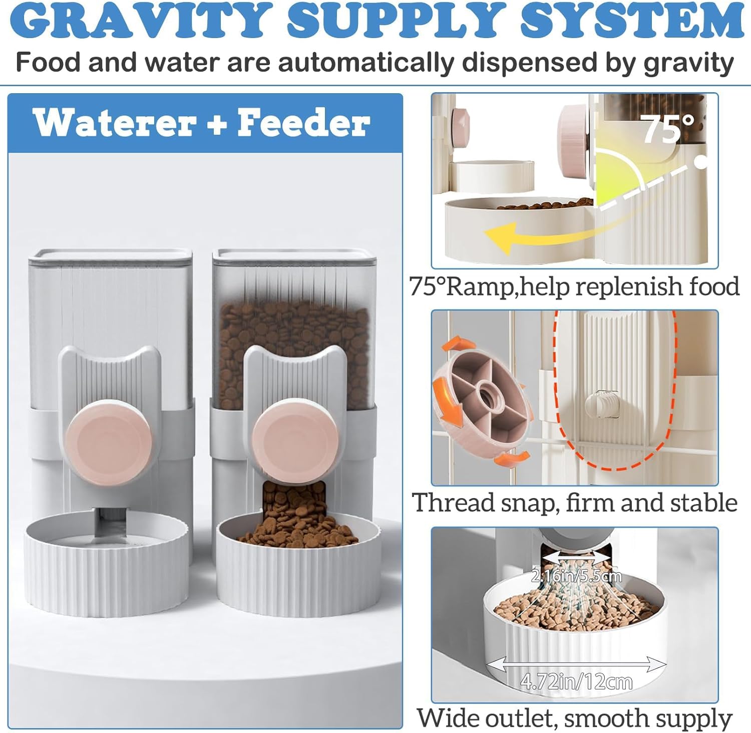 - And this rabbit food water dispenser has a 2.16-inch food outlet and a 75° inclined ramp that allows food to be fed smoothly into the bowl and prevents food clogging
