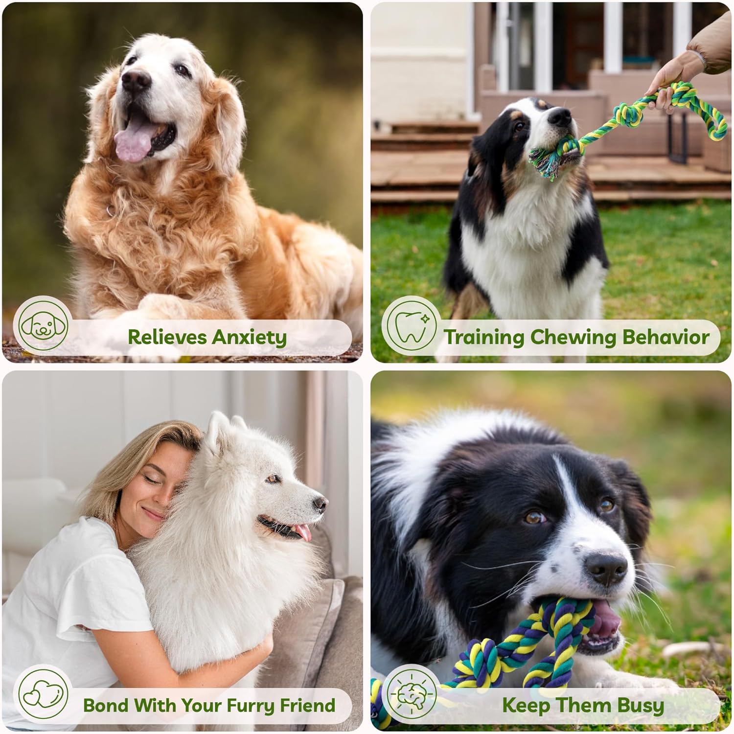 - 【INTERACTIVE TUG OF WAR DOG TOY】Dog rope as a teething toys, chew toys, boredom toys, training toys, to meet the dog's diverse play needs. You can throw to make your dog excited to chase; also have a tug of war with your dog to enhance bonding.