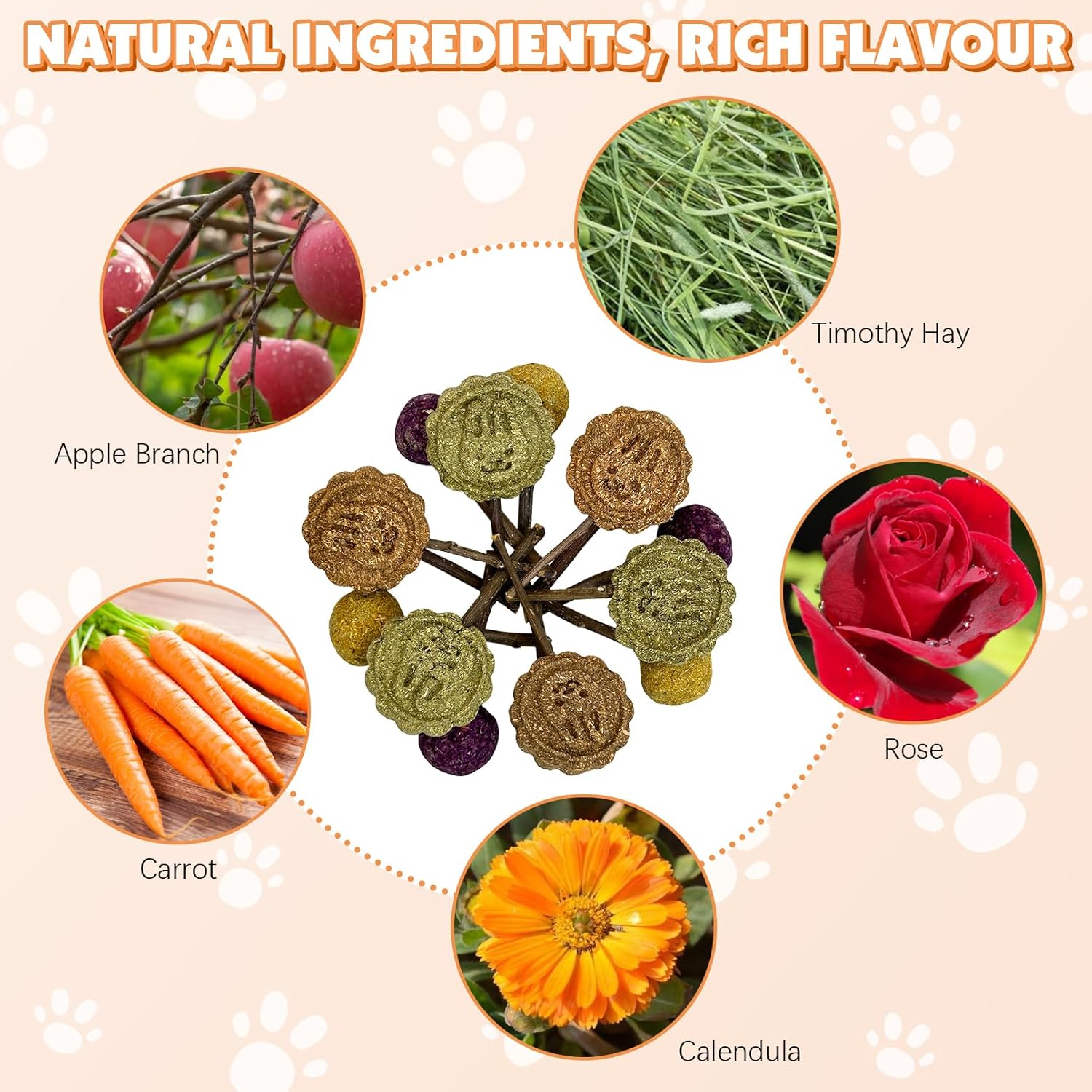 - ๐พ [Rich in Flavour]: Rabbit chew sticks package includes 3 x rose lollipops, 3 x calendula lollipops, 3 x timothy hay lollipops, 3 x bunny pattern timothy hay lollipops and 3 x bunny pattern carrot lollipops.