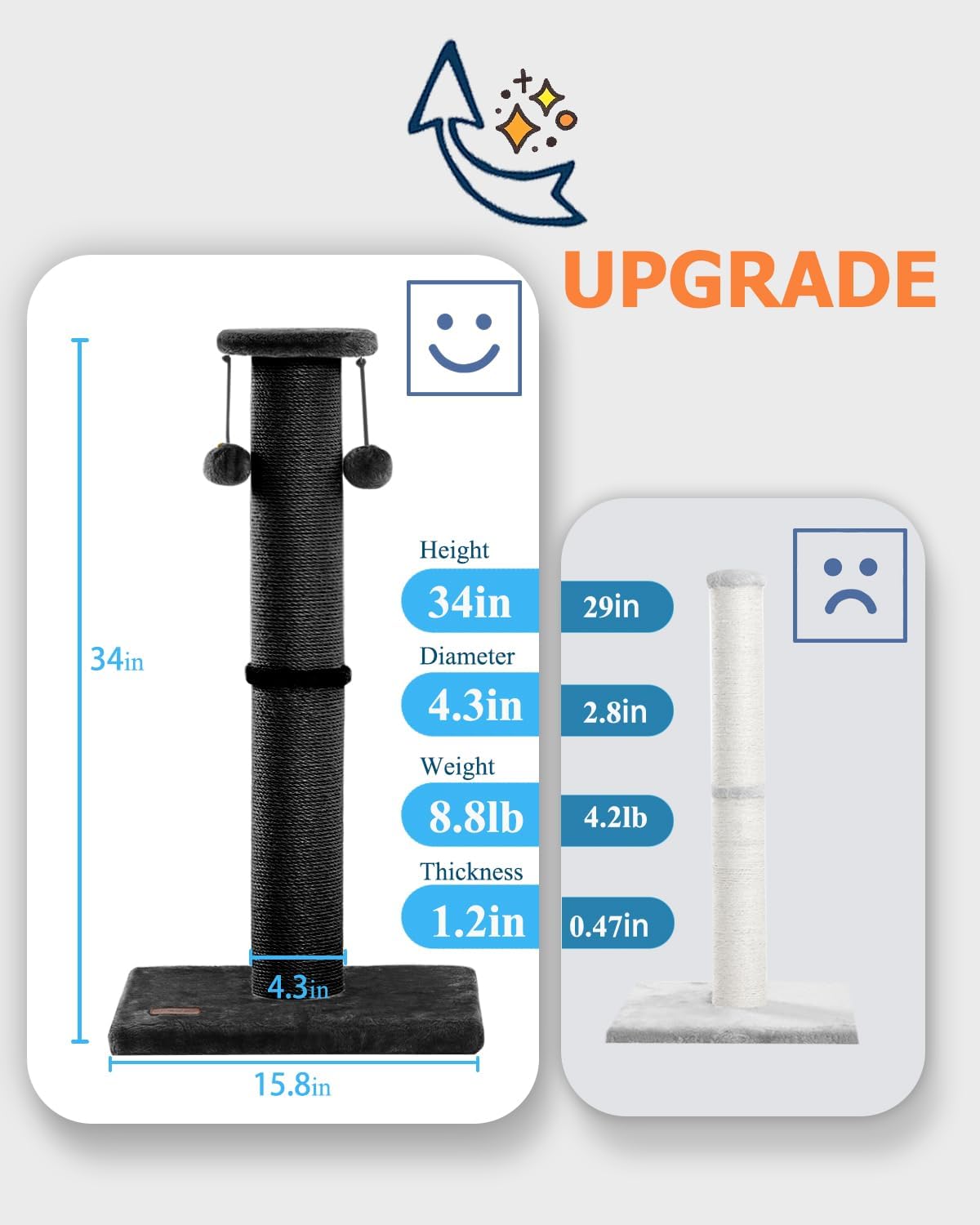 Kilodor 34Inch Tall Cat Scratching Post,4.3Inch Diameter Large Sisal Cat Scratch Post with Ball, Sturdy and Durable Cat Scratcher for Indoor Cats Adults Black