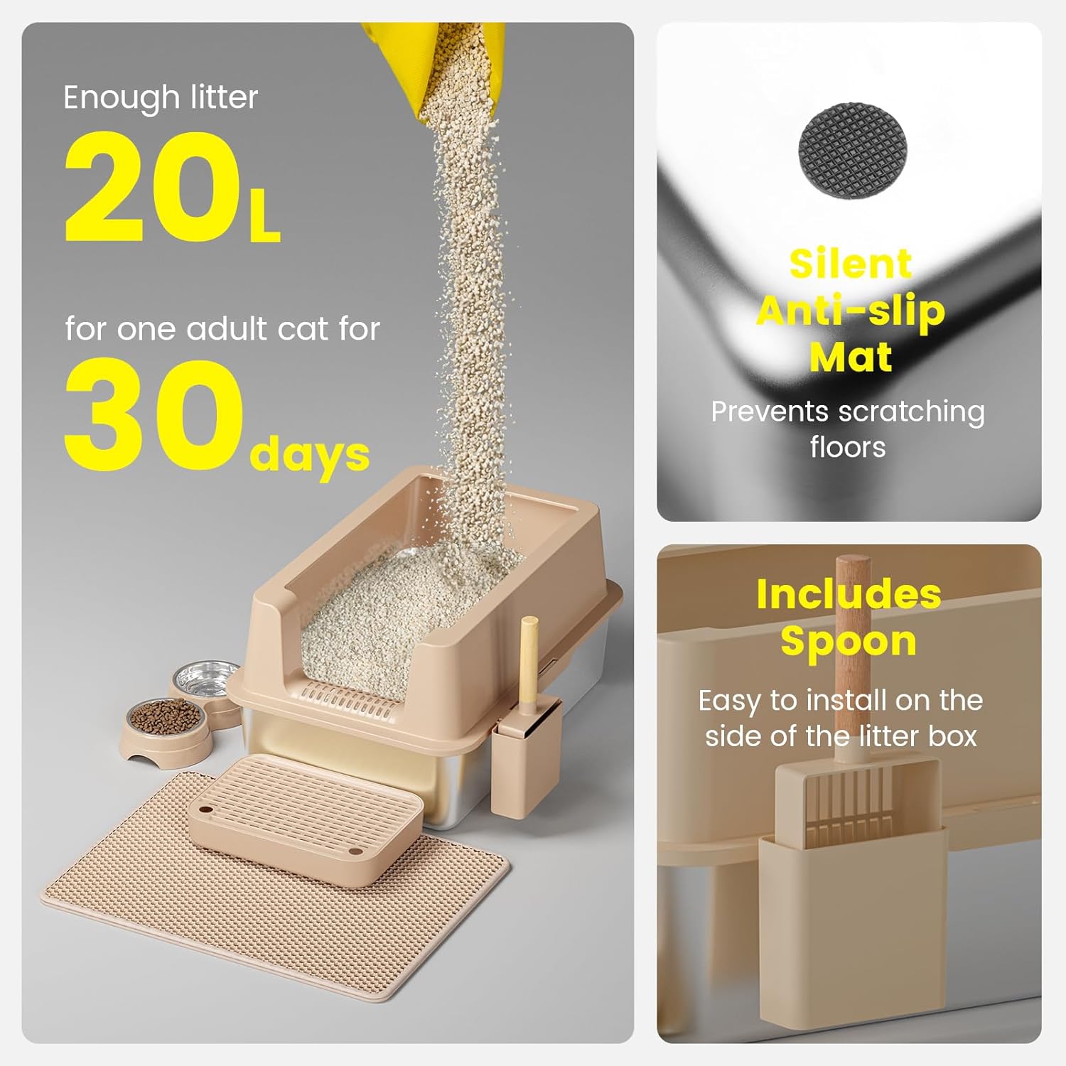 - 【EXTRA LARGE CAT LITTER BOX】 Our stainless steel cat litter box isn't just spacious; it's also a time-saver. With dimensions of 23.6" x 16" x 12", it offers an expansive realm for cats of all sizes. Plus, with its 20 liter capacity, you'll spend less time replenishing litter, giving you peace of mind for up to 30 days to enjoy doing what you love.