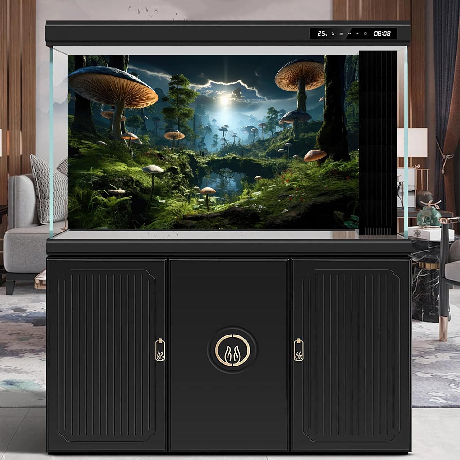 Fantasy Mushrooms Landscape Aquarium Background Tranquil Stream Cloudy Sky Terrarium Background Lush Green Tropical Plants Trees Fish Tank Backdrop Decoration Tank Background Poster 72x16in