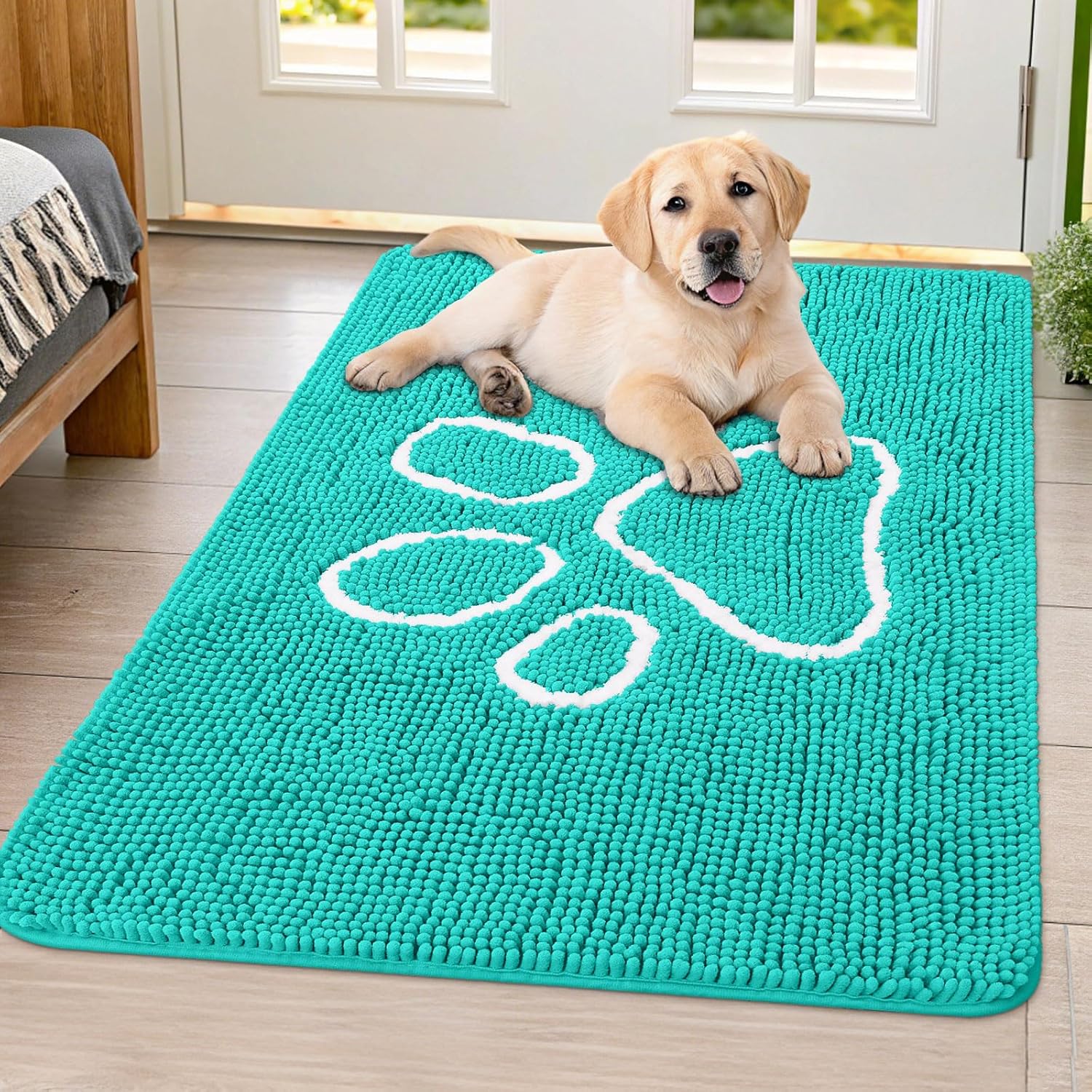 Smiry Dog Door Mat for Muddy Paws, Absorbent Dirt Trapper Non Slip Quick Dry Washable Chenille Mat for Mud Dogs, Entry Rug for Indoor and Outdoor (40x32 Inches, Turquoise)