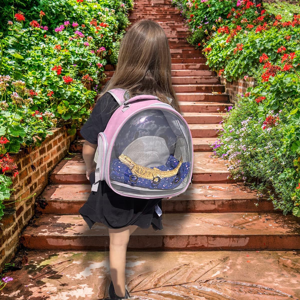 - The bearded dragon portable carrier backpack with leash is vented and breathable, crafted with breathable materials,side open window and pocket are made of anti-scratch mesh materials. 5 vents around the bubble carrier backpack,ensure sufficient air flow and allows lizard to breathe inside better.