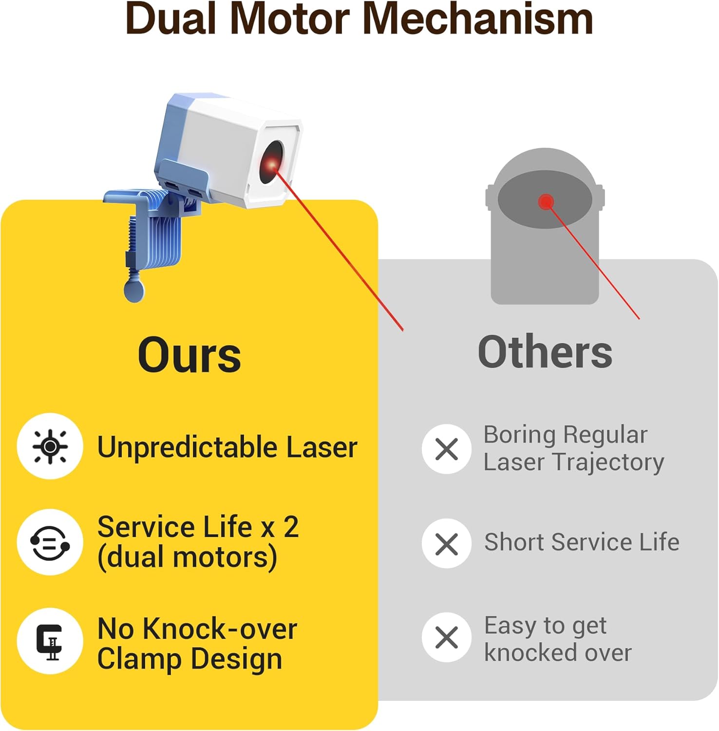 - Sturdy Clamp Design: Say goodbye to toys that easily topple! Whether it's clamped to a desk, shelves, nightstand, or other surfaces, our laser toy's innovative clamp design ensures it stands firm, even against the most energetic of cats. No more interruptions, just continuous play.