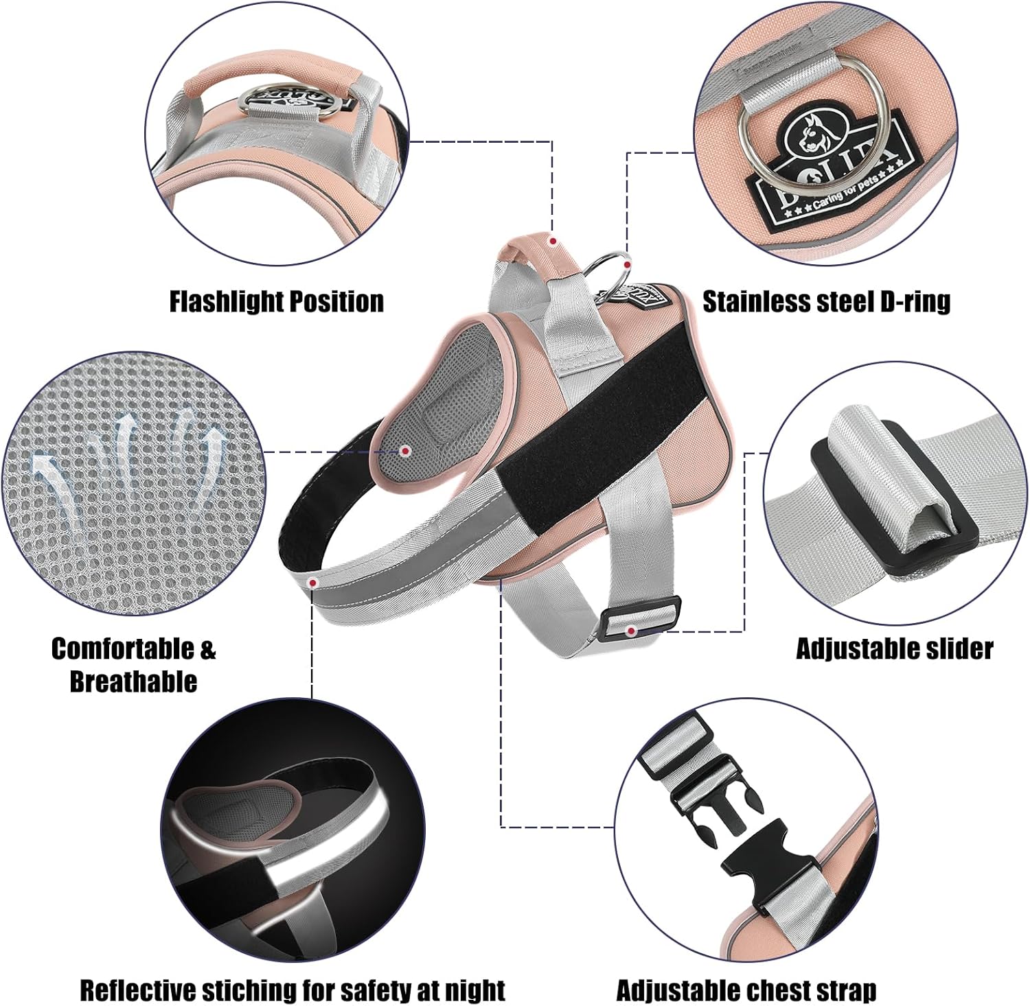 - SUPER COMFORTABLE: Bolux no choke dog harness pulling pressure is evenly distributed to the body to prevent pulling and choking. The dog vest harness have a adjustable chest strap with snap on buckle, move its body parts freely, can customized fits for your puppy growth do not need to always change it.
