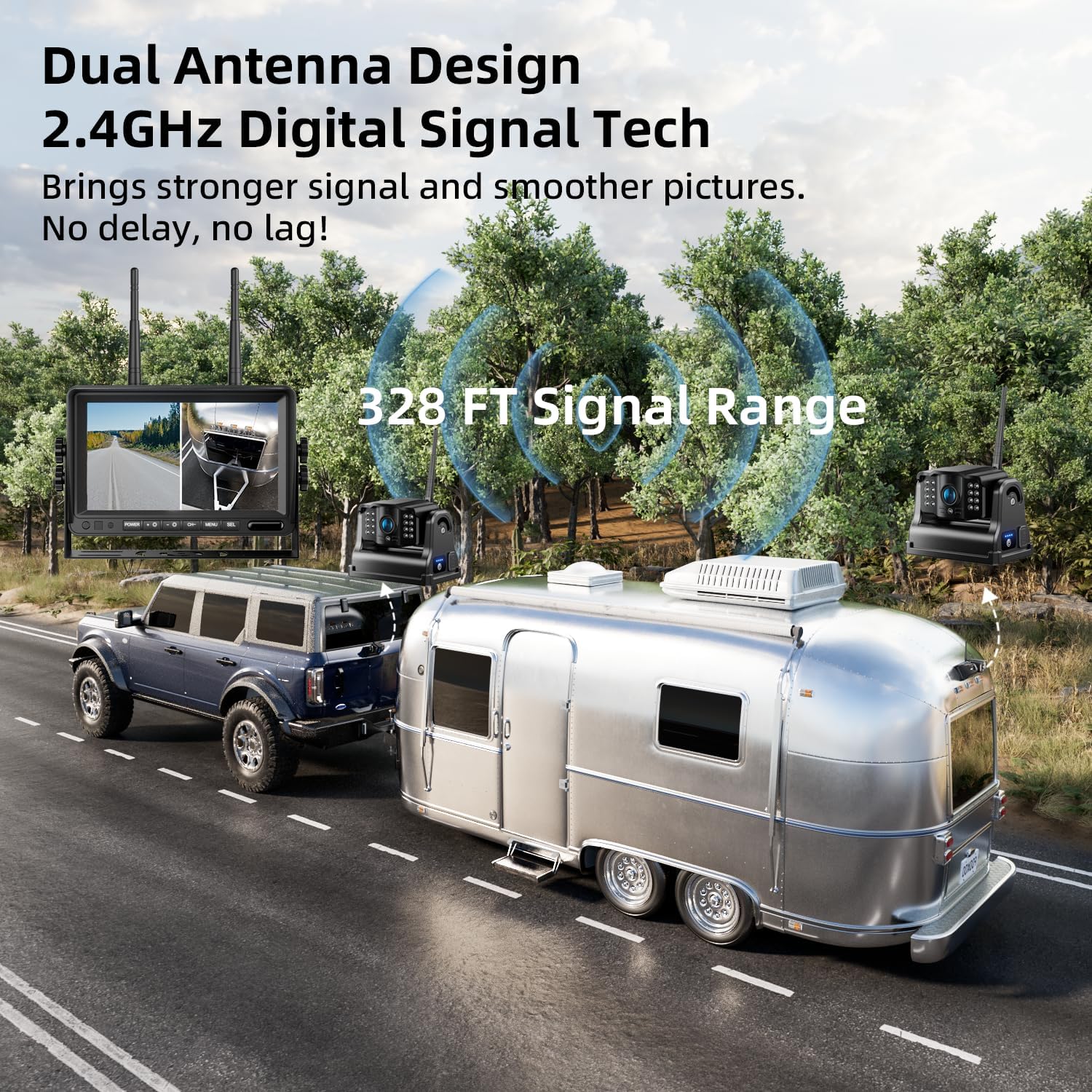 - Dual-antenna & 2.4GHZ Wireless Signal : Utilizing advanced 2.4GHz wireless signal technology and dual antenna design, it provides a more reliable and stable signal with no delay and no lag in images. With a reception range of up to 200ft in the open, it shows you your surroundings in real time, even at high speeds of 102 mph.Suits for car/SUV/camper/truck/voyager RV/jeep truck/pickup/horse trailer/fifth wheel/van/tractor/boat ect.