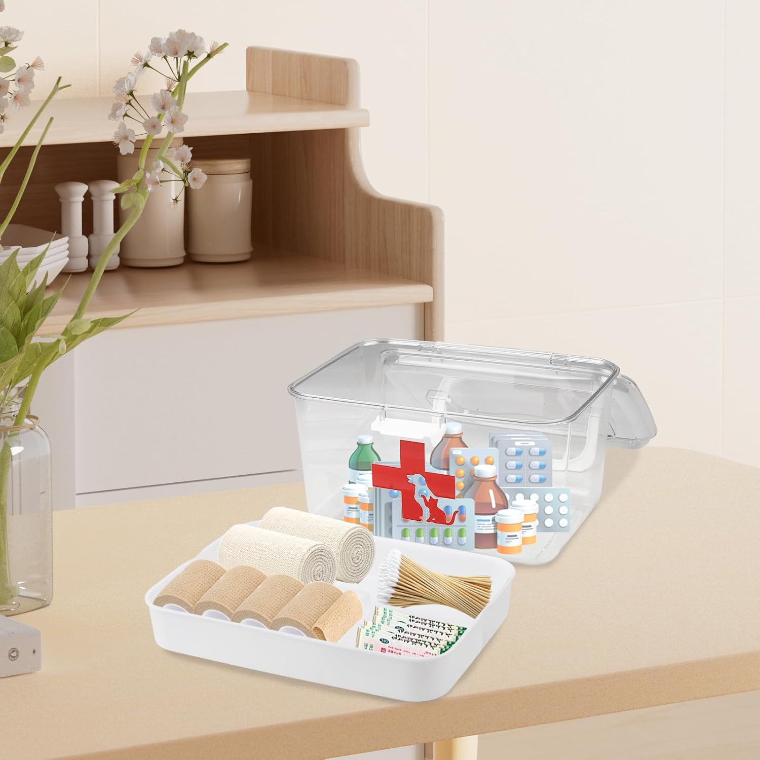 - 1.Clear Plastic Dog First Aid Box -The dog cat Medicine box Outside size: 9.84" (L) x 7.48" (W) x 5.9" (H), and is big enough for stocking necessary medical emergencies items. Features a cross symbol with for quick identification so you can provide aid to you loved girl or boy without delay.