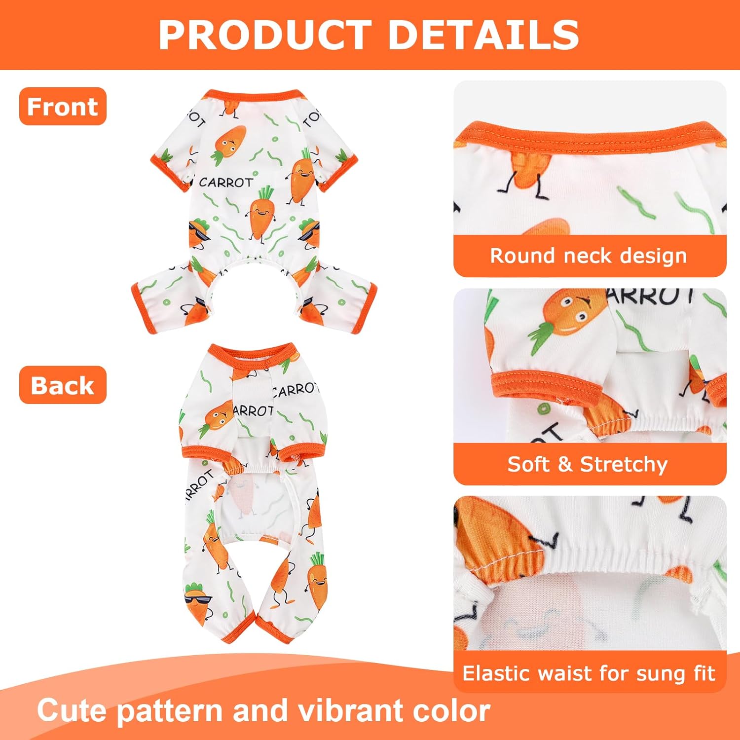 - 【CUTE DOG ONESIES FOR SMALL MEDIUM DOGS】Pajama has adorable CARROT graphics all over. Vibrant color and cute pattern, making it a cute and Number 1 in your pet's wardrobe. High-quality graphic pjs printed with advanced equipment to ensure lasting durability. Great for cozying up around the house or for themed photo ops. The PinkBow pet clothes are the go-to PJs for cats and dogs alike.