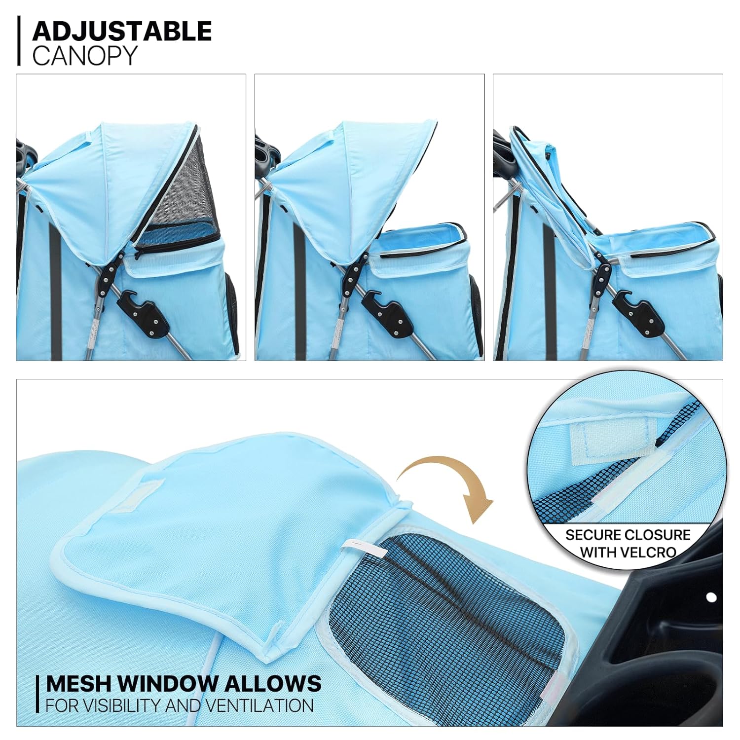 - Humanized Design - With convenient features like swivel front wheels, cup holders, and a hooded peak-top window, this pet stroller makes taking your pet out for exercise and fresh air an easy and enjoyable experience. The roomy design and undercarriage storage basket give you plenty of space to carry your essentials, too.