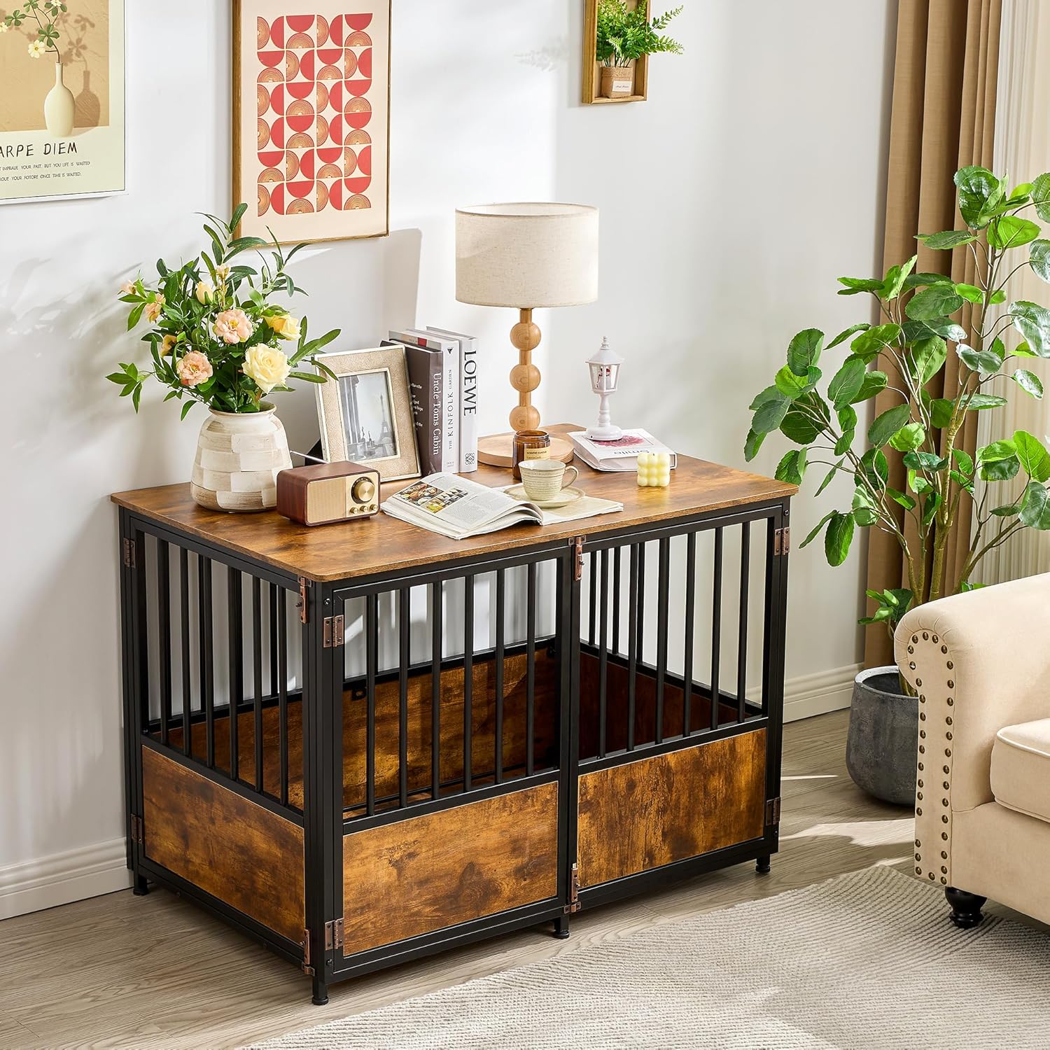 KOOPRO 43.7" Inch Dog Crate Furniture with Cushion for Large Dogs, Wooden Heavy Duty Dog Kennel with Double Doors Indoor, Decorative Pet House Dog Cage Side End Table, Rustic Brown
