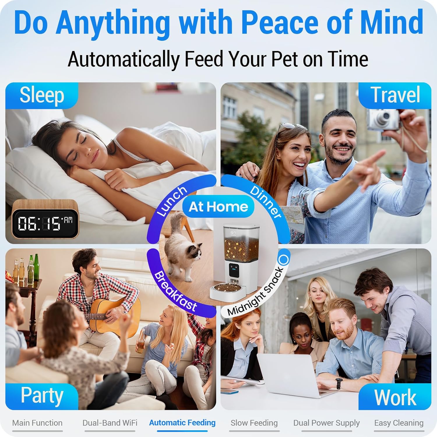- Remote APP Control : The Automatic cat feeder can connect to 2.4GHz or 5GHz network. Program and monitor your pet's meals anywhere anytime through the “Smart Life” App on your iOS or Android smartphone. You can set up a feeding schedule of up to 30 meals per day, with 1-12 portions per meal. Also reward your pet by feeding it remotely from outdoor via the app. The app can also check feeding records and share to family members' smartphones for control.