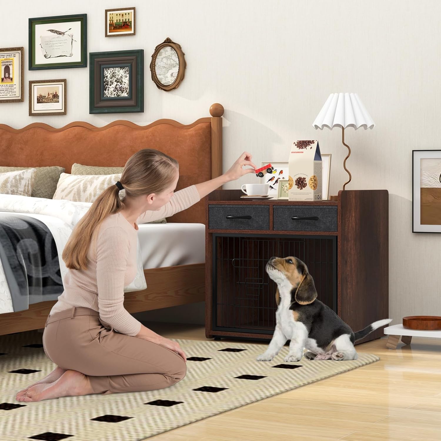 - 2 in 1 Multifunctional Design: This versatile dog crate is a wonderful piece of furniture for organizing your items and taking care of your pet. It can functions as an elegant end table in the living room or a comfortable dog crate for your furry friends.