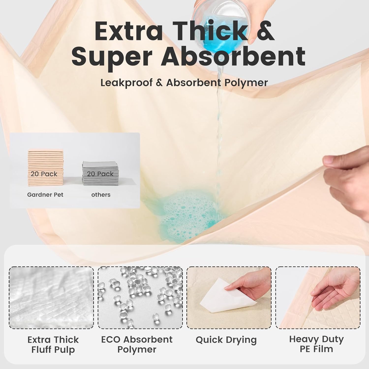 - QUICK DRYING: The wee pads for dogs xl is increased the content of polymer absorbent materials that converts liquid to gel in seconds, quickly absorbing and locking in the liquid to reduce odor. This keeps your pet's belly, legs or paws from getting wet, leaves no paw prints on the floor and gives a cleaner living environment for pets and their owners.