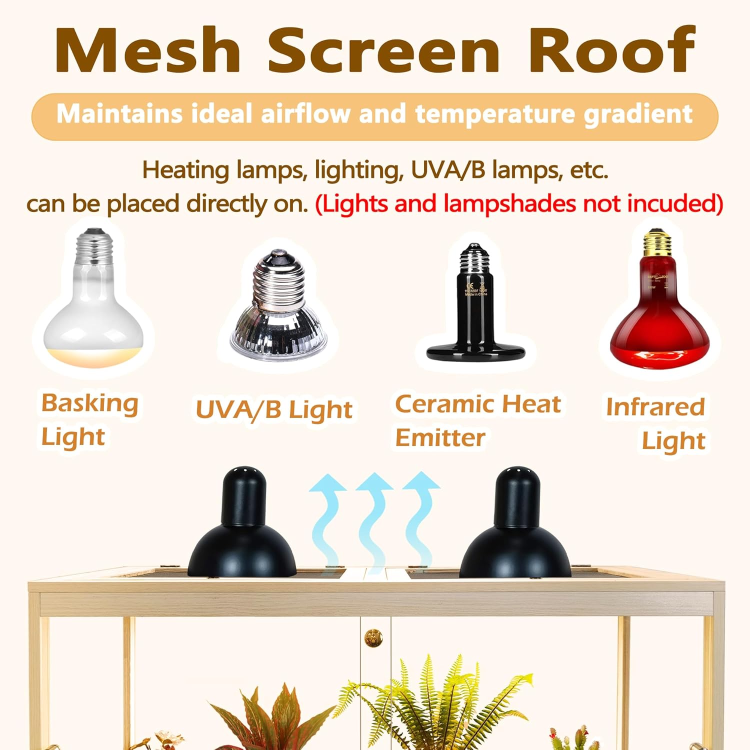 - 【Functional Elegance】Designed with functionality in mind, our reptile terrarium features double sliding front doors that can be effortlessly opened or secured with a lock to prevent escape attempts. The top is fitted with sturdy metal mesh, allowing for proper ventilation and accommodating the direct placement of heat lamps and UVA/B lights (not included) to ensure optimal temperature regulation.