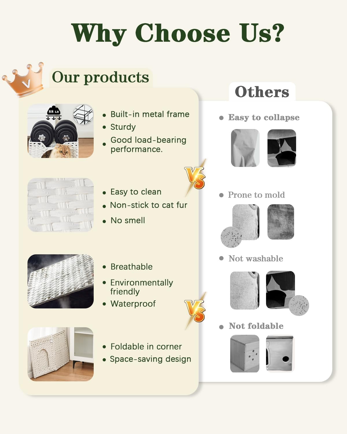 - Premium Materials: The cat caves for indoor cats are handwoven from durable synthetic rattan material, makes the cat scratch house soft and cozy. One double-sided cushion makes the big cat bed breathable in summer and warm in winter, ideal for all seasons