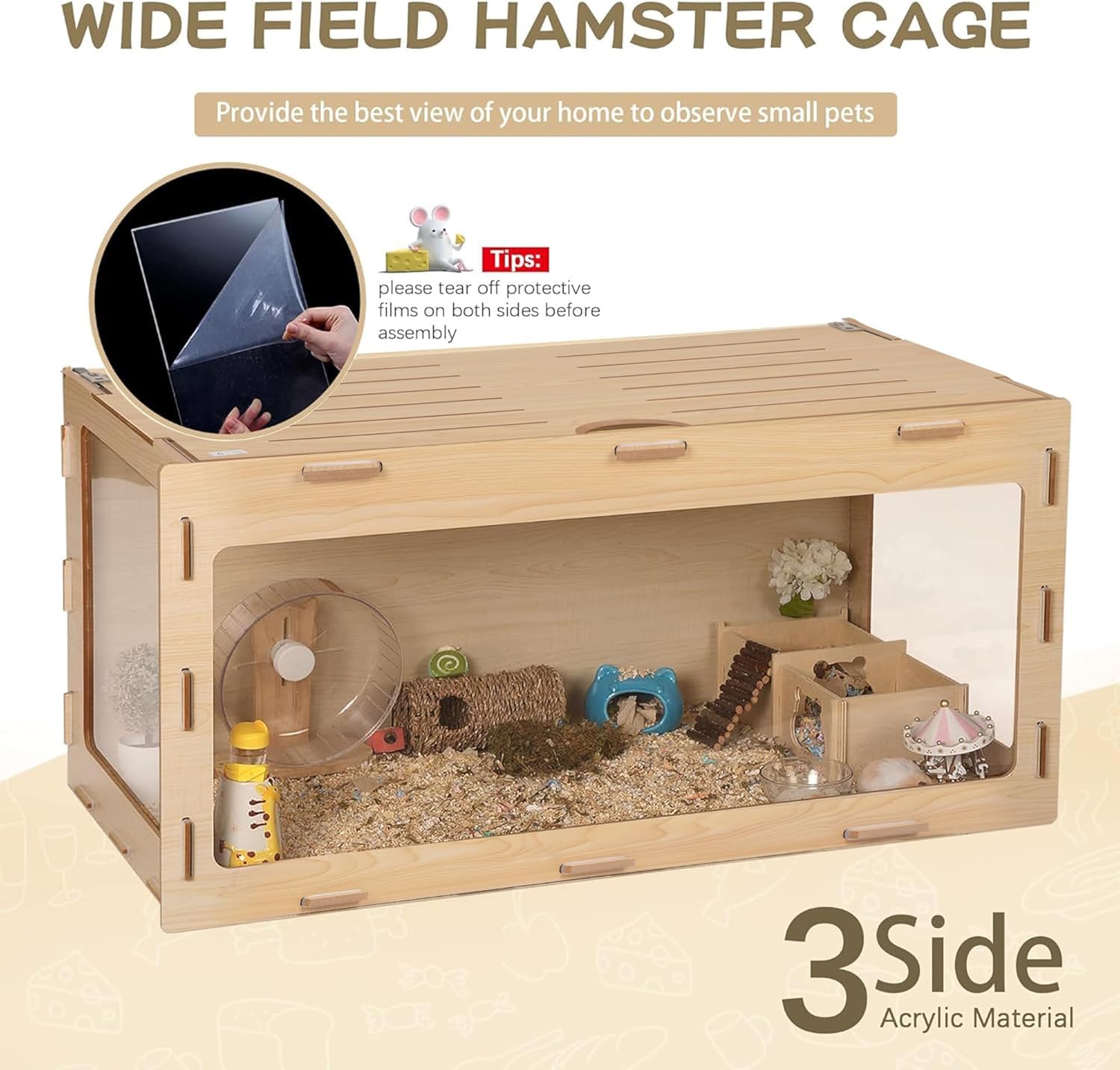 - 【Chewproof & Safe Design】This wooden hamster cage is made from high-quality wood (MDF) and thick clear acrylic panels that are securely connected with no gaps. The solid panel design keeps hamsters from chewing on the wood or trying to escape, while also providing effective protection against intruders. Each part is carefully wrapped in multiple layers of pearl cotton to make sure the product arrives in great condition