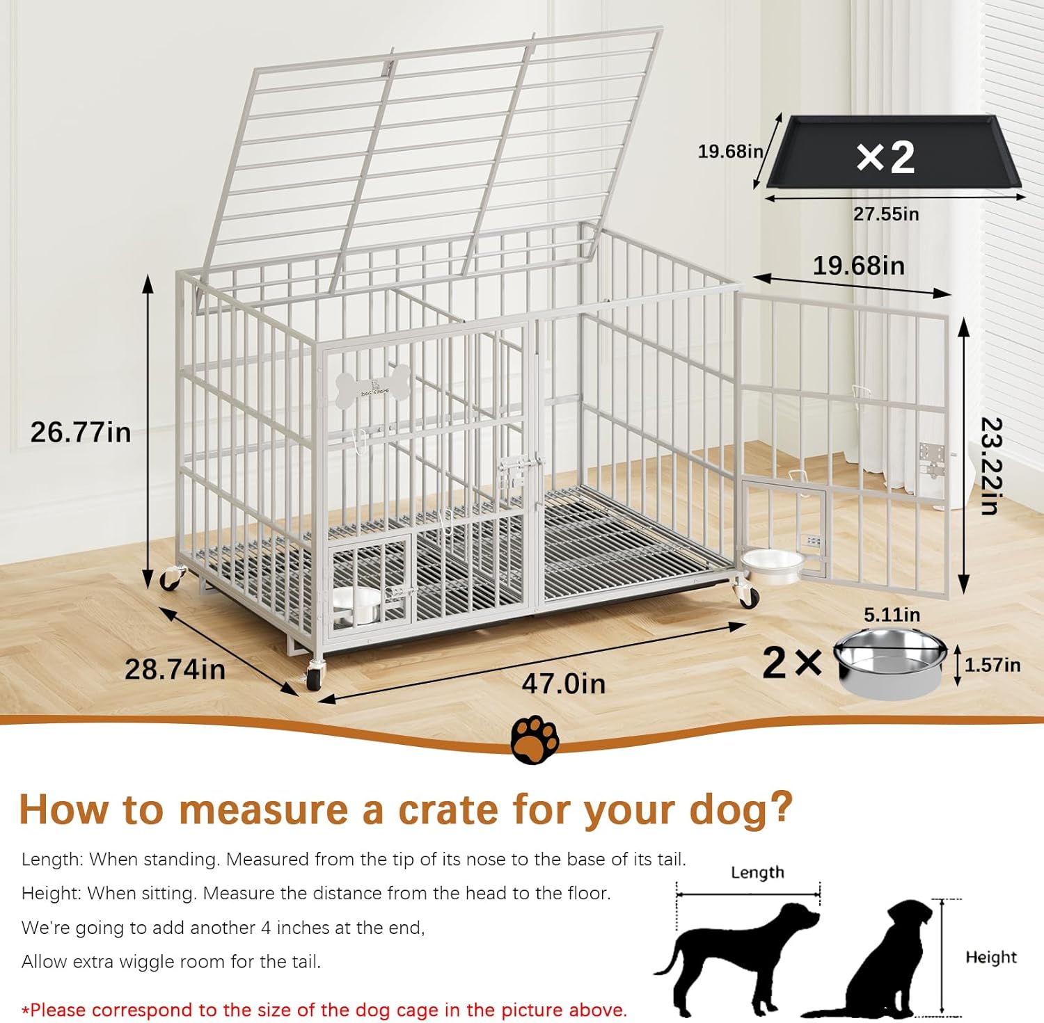 - 【Sturdy & Safe】The overall size of the dog crate is 47.25 * 28.74 * 27.17 inch (120 * 73 * 69 cm). There are two sizes for you to choose from.This sturdy dog crate is constructed of high quality and strong metal frame structure, the frame is coated with multiple layers of protective coating to prevent rust and corrosion. The coating on the frame is non-toxic and safe for dogs. The rust-resistant and sturdy construction makes this dog crate both strong and safe for your pet's daily use.