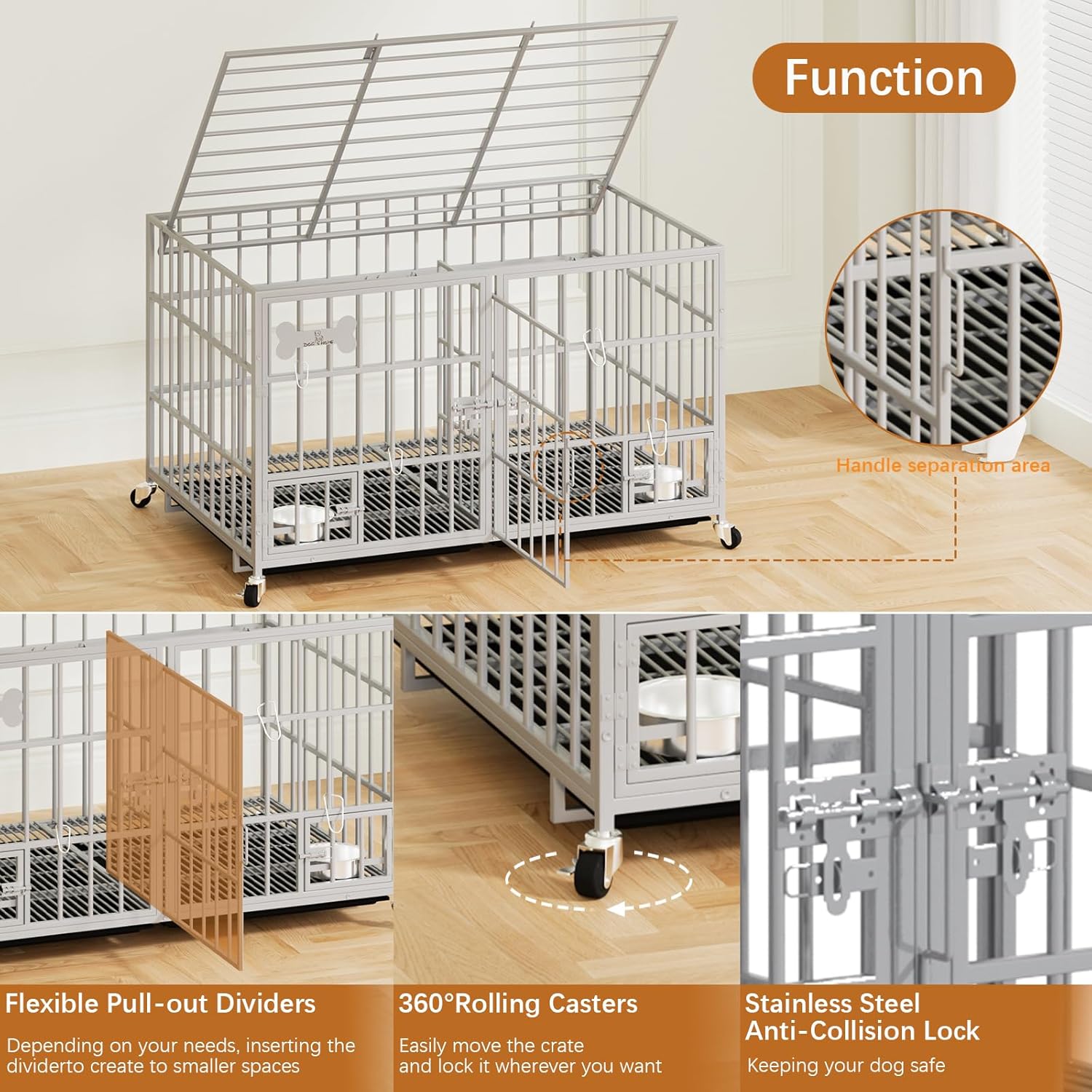 - 【Practical & Easy to Move and Clean】The dog crate comes with four smooth rolling locking wheels for easy movement and fixation, you can easily move the crate to different positions as needed. The dog crate comes with two pull-out tray for easy removal and cleaning. It also comes with a safety latch to avoid your smart dog from opening the iron door, effectively protect your pet.