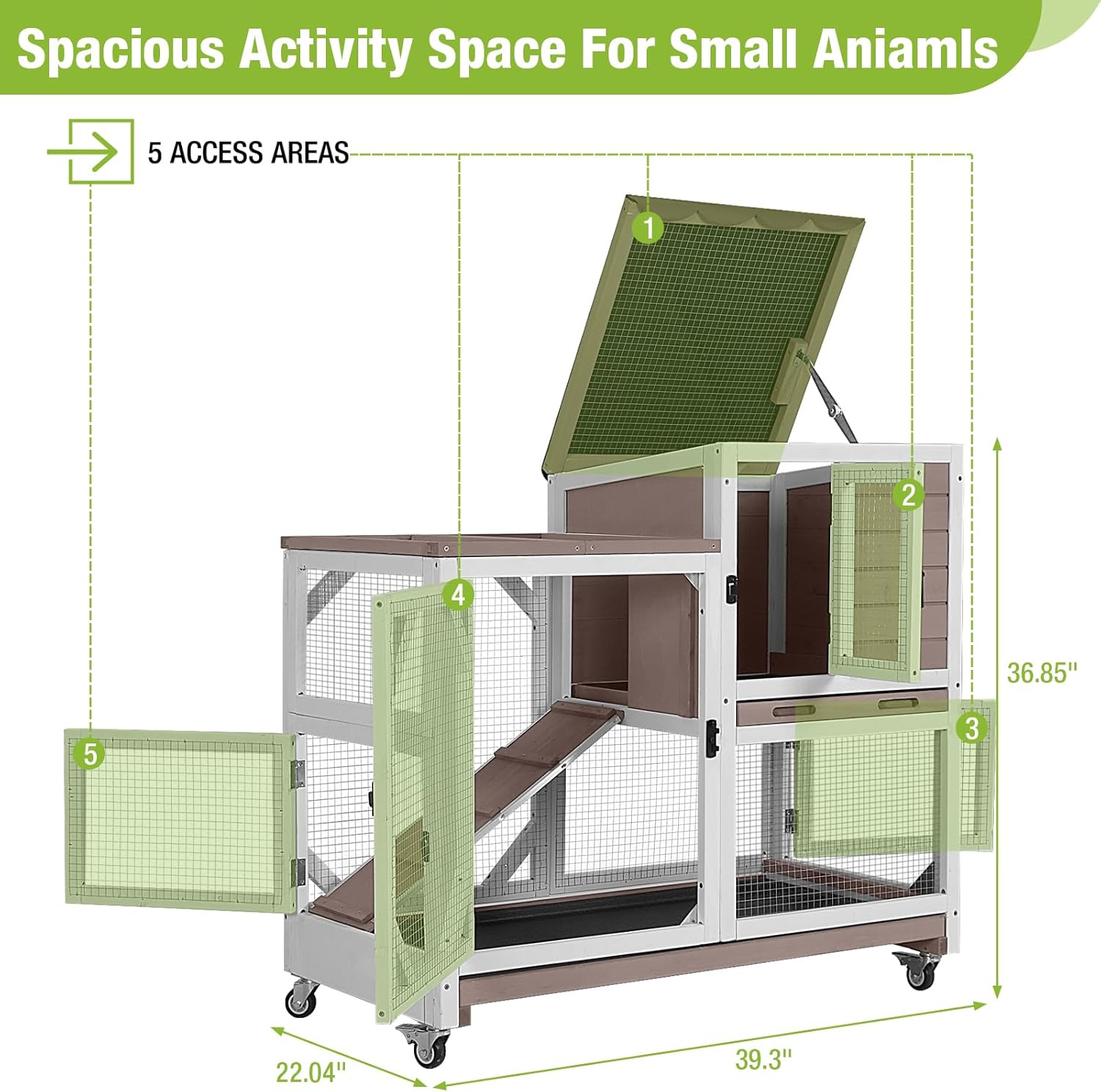 - Cozy Home for Pets: Our 2-story hutch, sized at 39.37’’L*22.04’’W*36.8’’H, is a spacious sanctuary for your small animals like guinea pigs, rabbits, or chicks, offering them a comfortable and secure place to play and rest