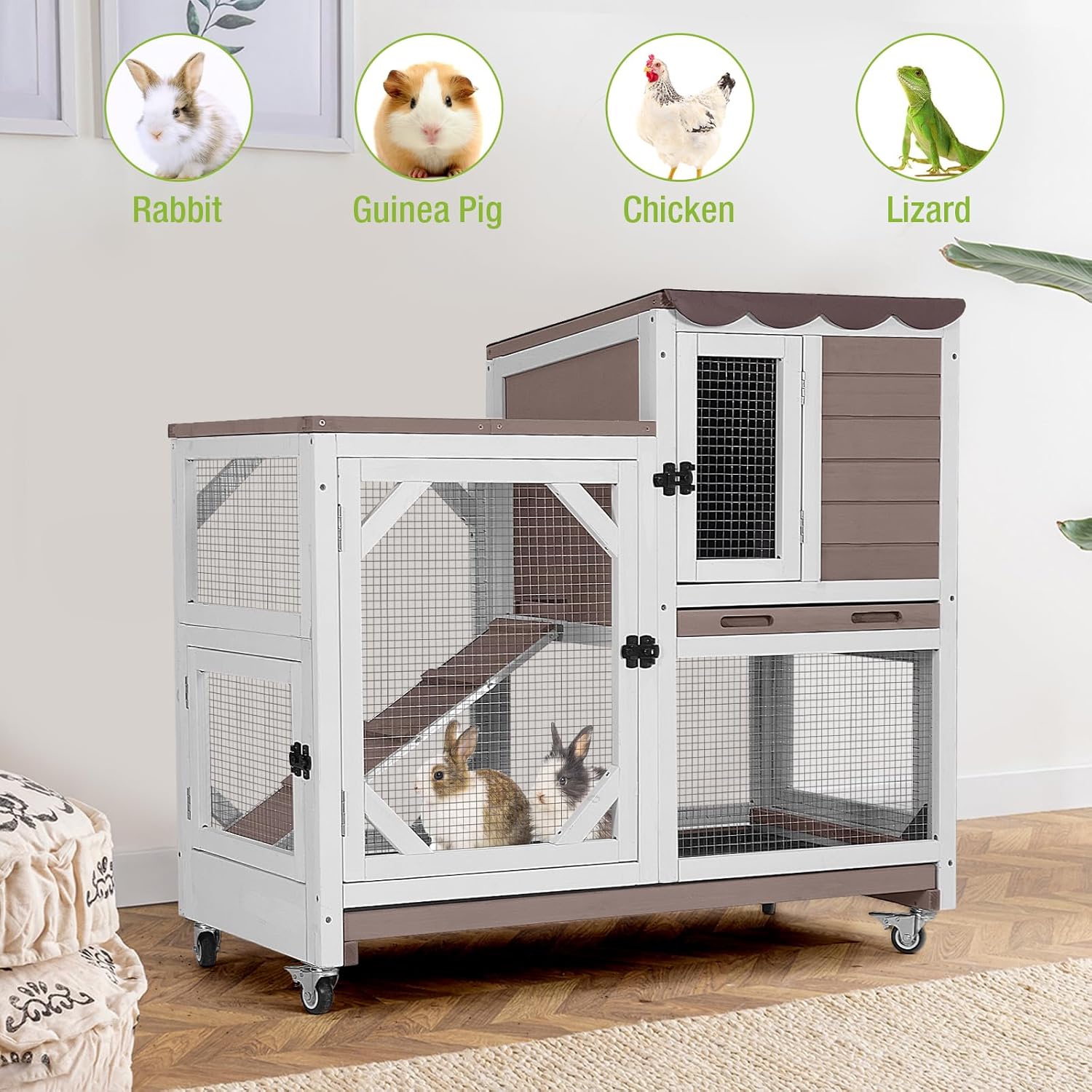 GUTINNEEN Rabbit Hutch Indoor Outdoor 2 Story Bunny House on Wheels Wood Rabbit Cage with 2 Pull Out Trays Guinea Pig Cage