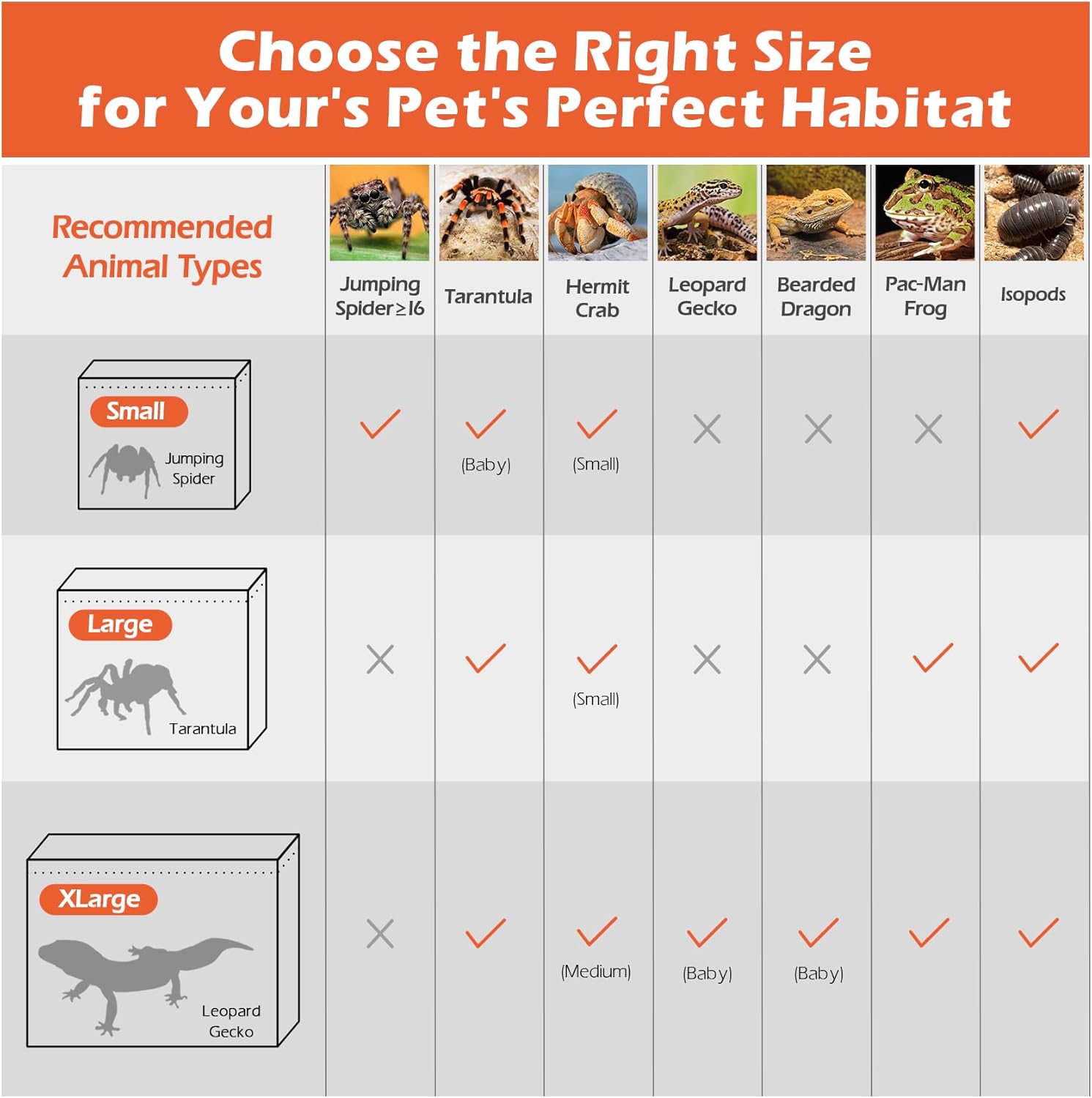 - Clear 360° View: Designed with full transparency, this leopard gecko habitat offers a panoramic view, allowing easy observation of your pets from every angle. Ideal for housing hermit crabs, geckos, tarantulas, and other small creatures