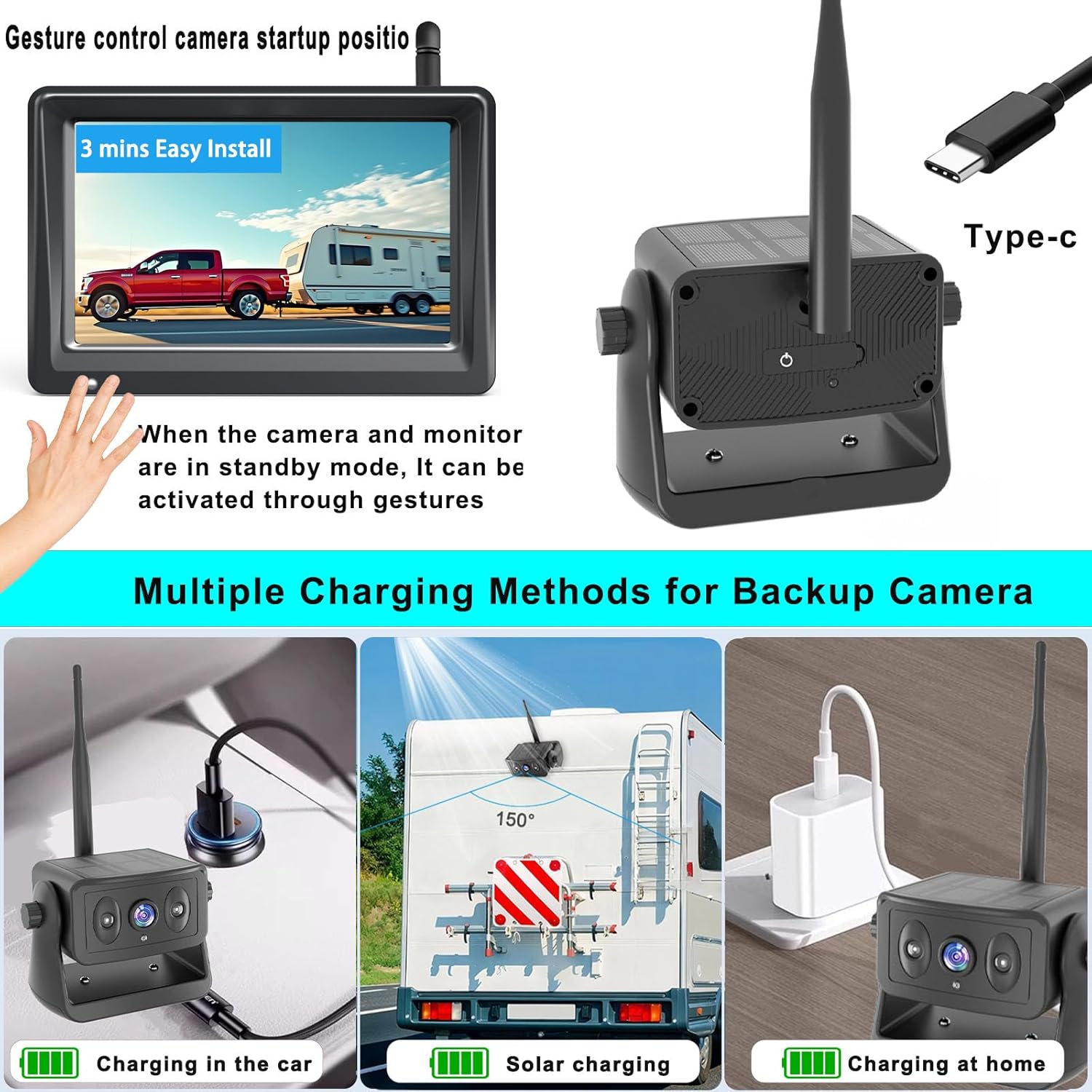 Wireless Backup Camera for Trucks & RVs, Solar - Powered - Magnetic, Portable, No - Drill, No - Wire Easy Install, Night Vision, Rechargeable with 5" HD Monitor systems for Car, Camper, Trailer