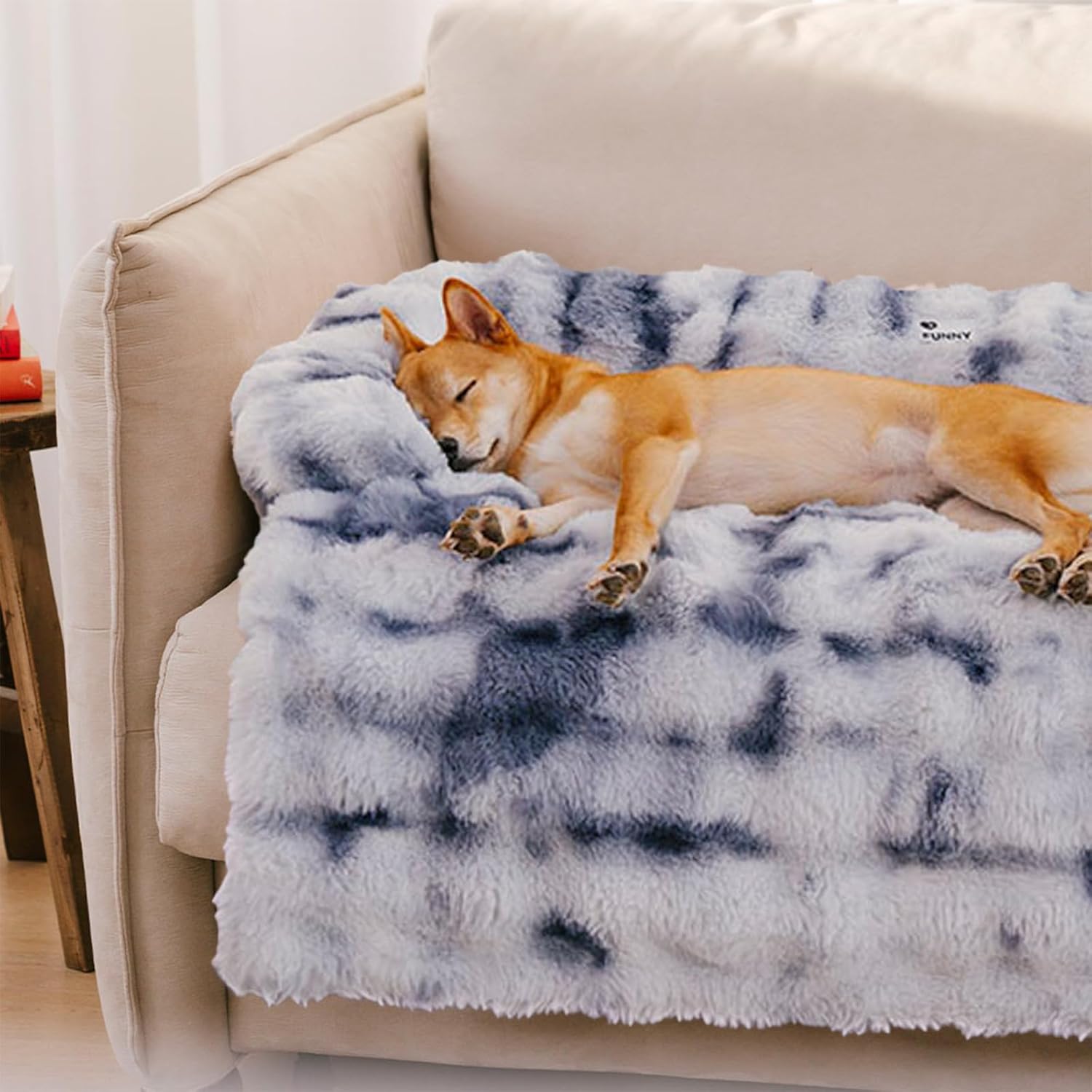 FUNNY FUZZY Pet Fluffy Plush Calming Dog Couch Bed Sofa Protector Washable Pets Mat for Large Medium Small Dogs and Cats (Tie-dye Blue,47.24 × 37.4 × 6.3 in)