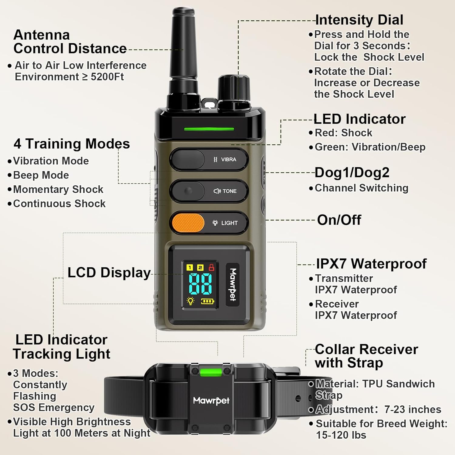 - 【5200 FT Range and Easy Storage】Mawrpet dog training collar with remote has a range of up to 5200 FT, allowing you to train your dog even when you're at a distance outdoors. When you're not using the remote, you can easily attach it to your waistband for convenient carrying; you don't have to worry about losing it. The instant response safety on/off button ensures you don't have to worry about accidental touch.