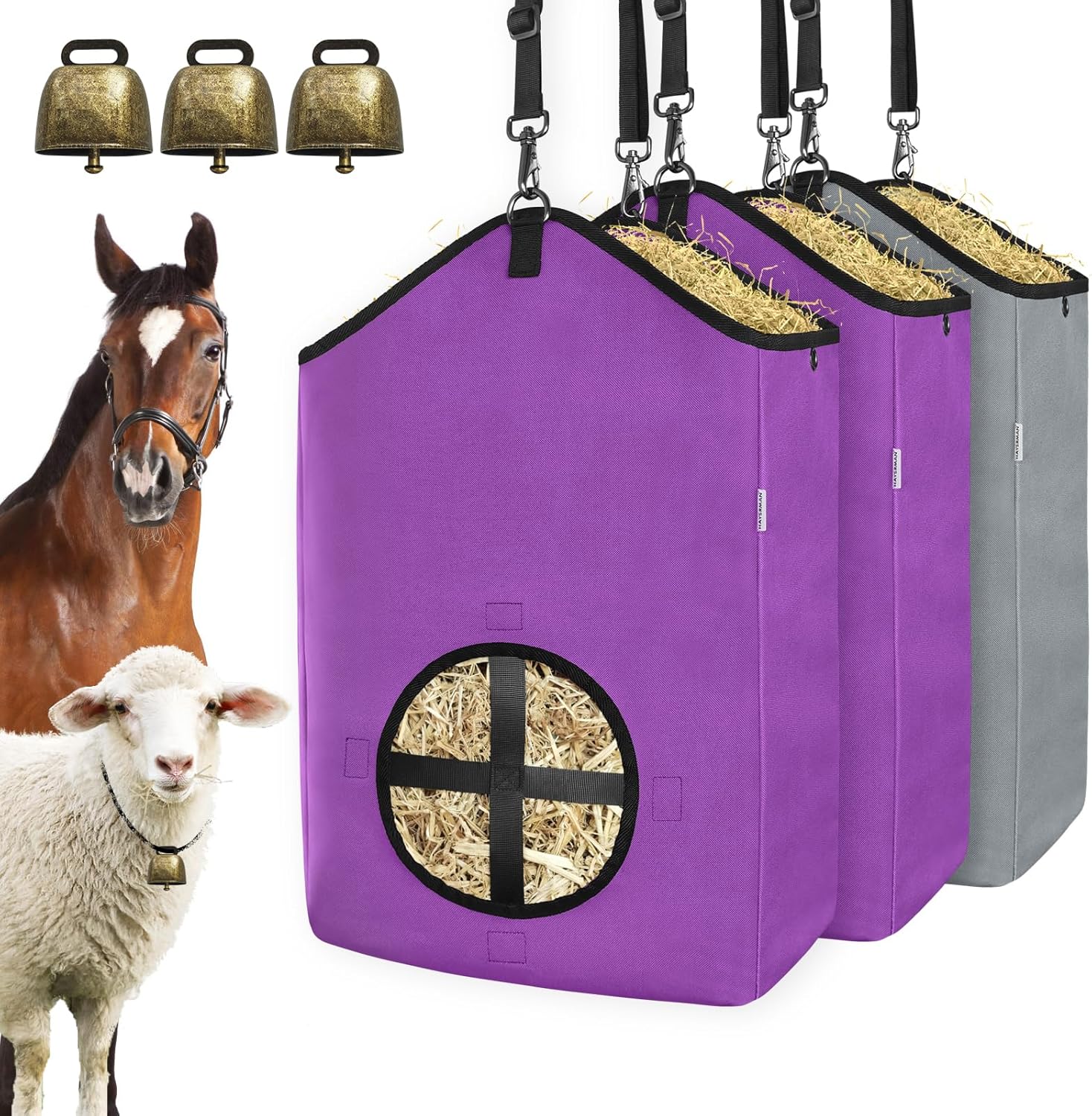 3 PCS Goat Hay Feeder,Hay Bags for Horses,Goats,Donkeys with Reinforced Oxford Fabric and High Strength Metal Clasp,Horse Feeding Supplies with Adjustable Strap for Easy Hanging (2Purple+1Grey)