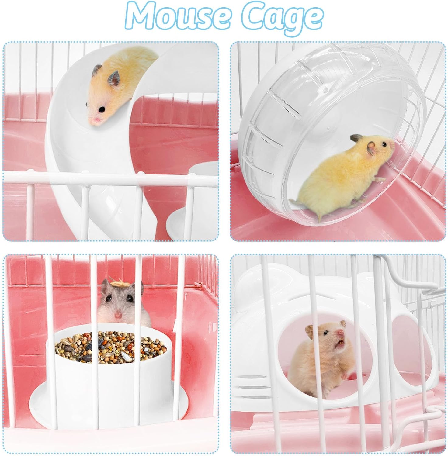 - Hamster cage: Set includes mice cage*1, castle house*1, 2nd floor platform*1, slide*1, running wheel*1, water bottle*1, food bowl*1. The hamster cage has a sturdy structure, which allows you to ventilate the cage and see your pet's activities