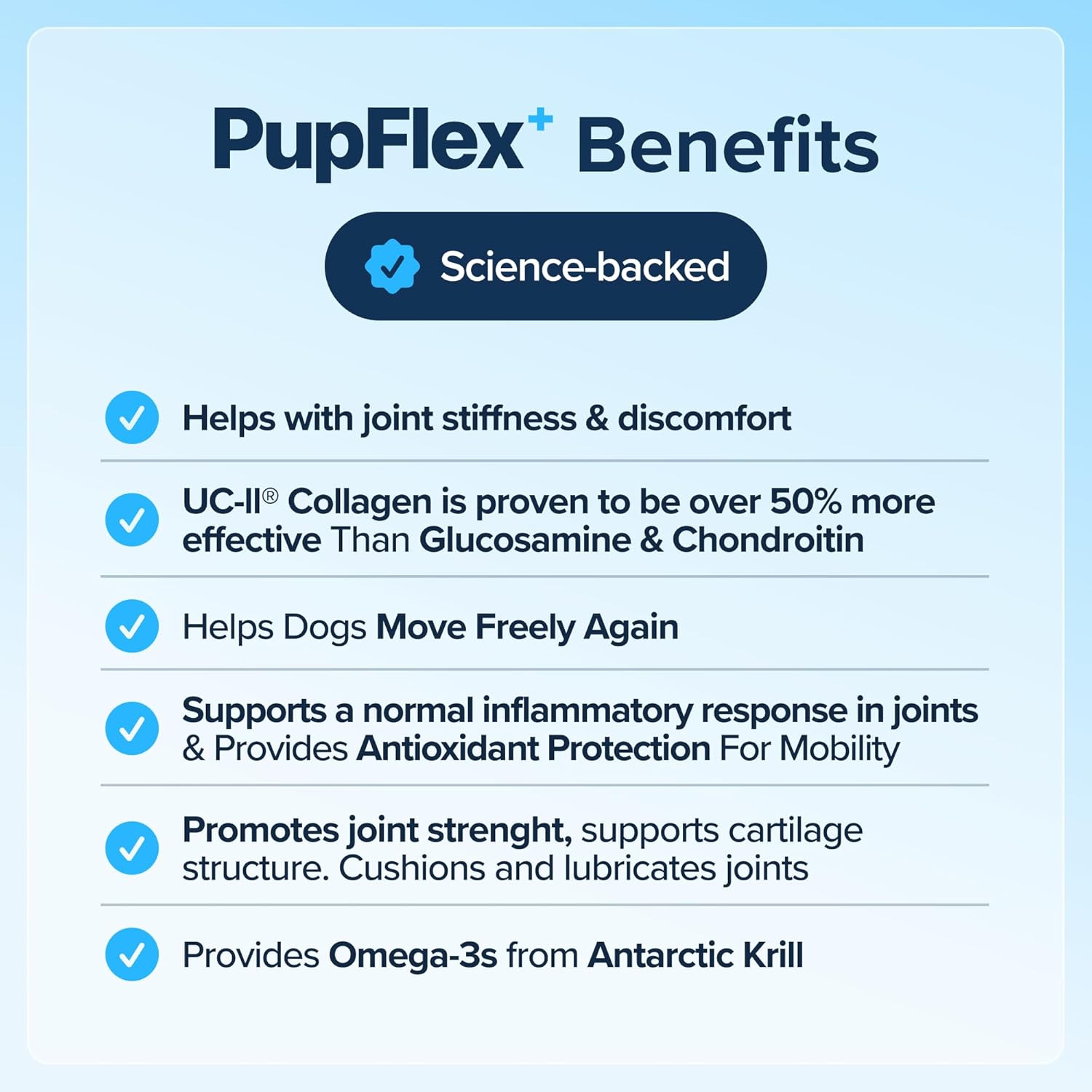 - VET-FORMULATED HIP & JOINT CHEWS FOR DOGS – Powered by UC-II dog collagen, PupFlex+ is a premium dog joint supplement for large breed, medium and small active pups. It supports flexibility and helps restore mobility in just 30 days.