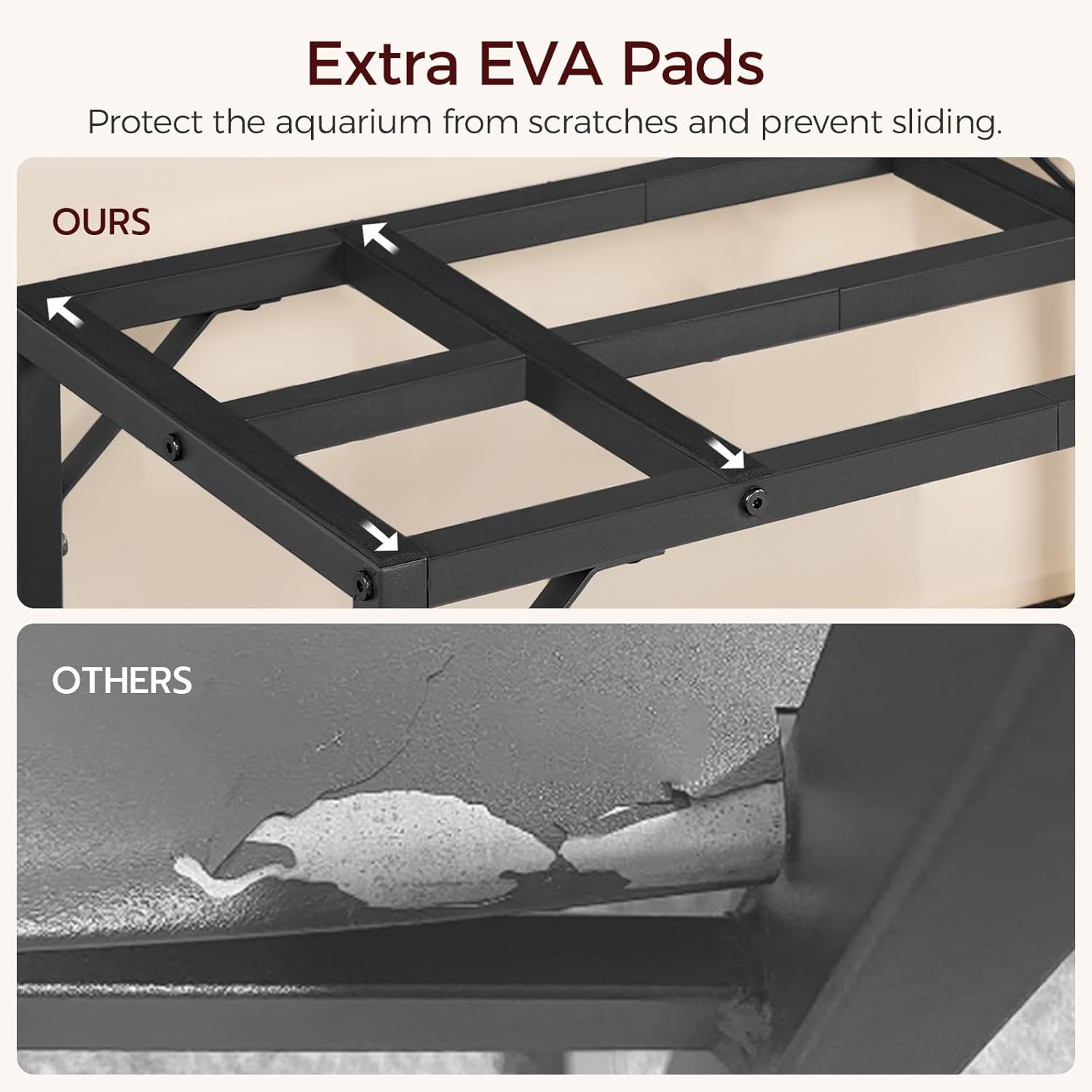 - Sturdy Build: The 40-50 gallon fish tank is made of heavy-duty metal, with a top cross-frame for stability and corner triangles for extra strength. The top covered with EVA pads keeps your aquarium from slipping, making it a reliable choice to support your tank