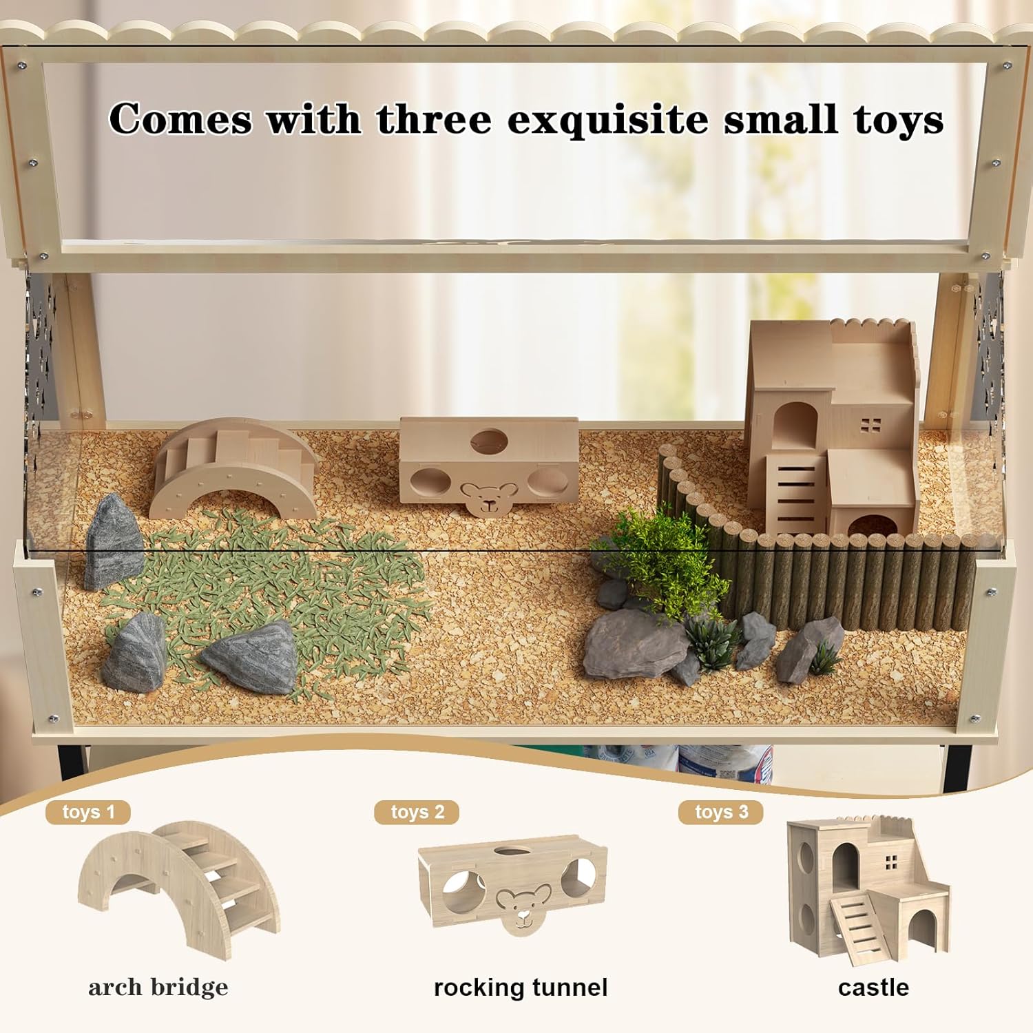 - ๐ใGood Ventilationใ: The cage is made of wood frame and clear acrylic panels, providing a durable and lightweight structure. The four sides are wrapped with wooden strips to prevent hamsters from chewing on the cage and protect their teeth.