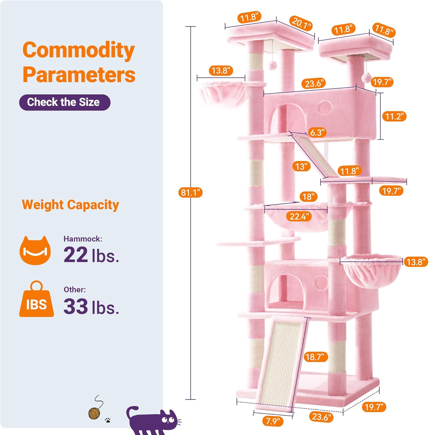 Allewie 81 Inches Tall Cat Tree/Multi-Level Large Climbing Tree House and Towers for Big Feline/Condo and Hammock/Scratching Post/Wide Base/Pink