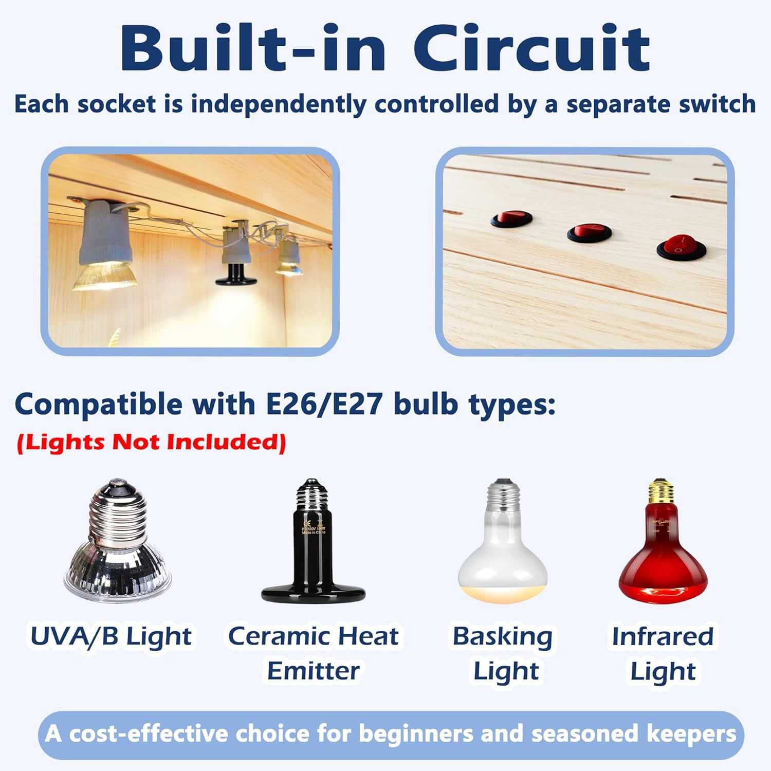 - 【Integrated Lighting Sockets】Equipped with three built-in sockets compatible with E26/E27 bulbs, including heat lamps and night lights (bulbs not included), allowing you to customize the lighting setup to suit your reptile's needs.