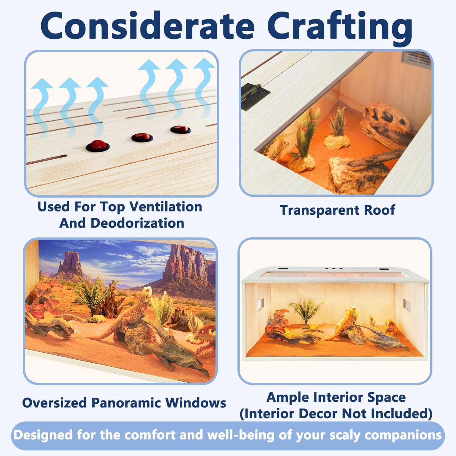- 【Spacious Reptile Enclosure】Tailored for reptile lovers, this habitat provides ample space for reptiles to explore comfortably. Clear acrylic panels on the front and top allow for full visibility of your pet, while the ventilated top ensures adequate airflow. Note: This enclosure is not designed to hold water and comes in four size options.Note: Items Inside of the cage are NOT included.