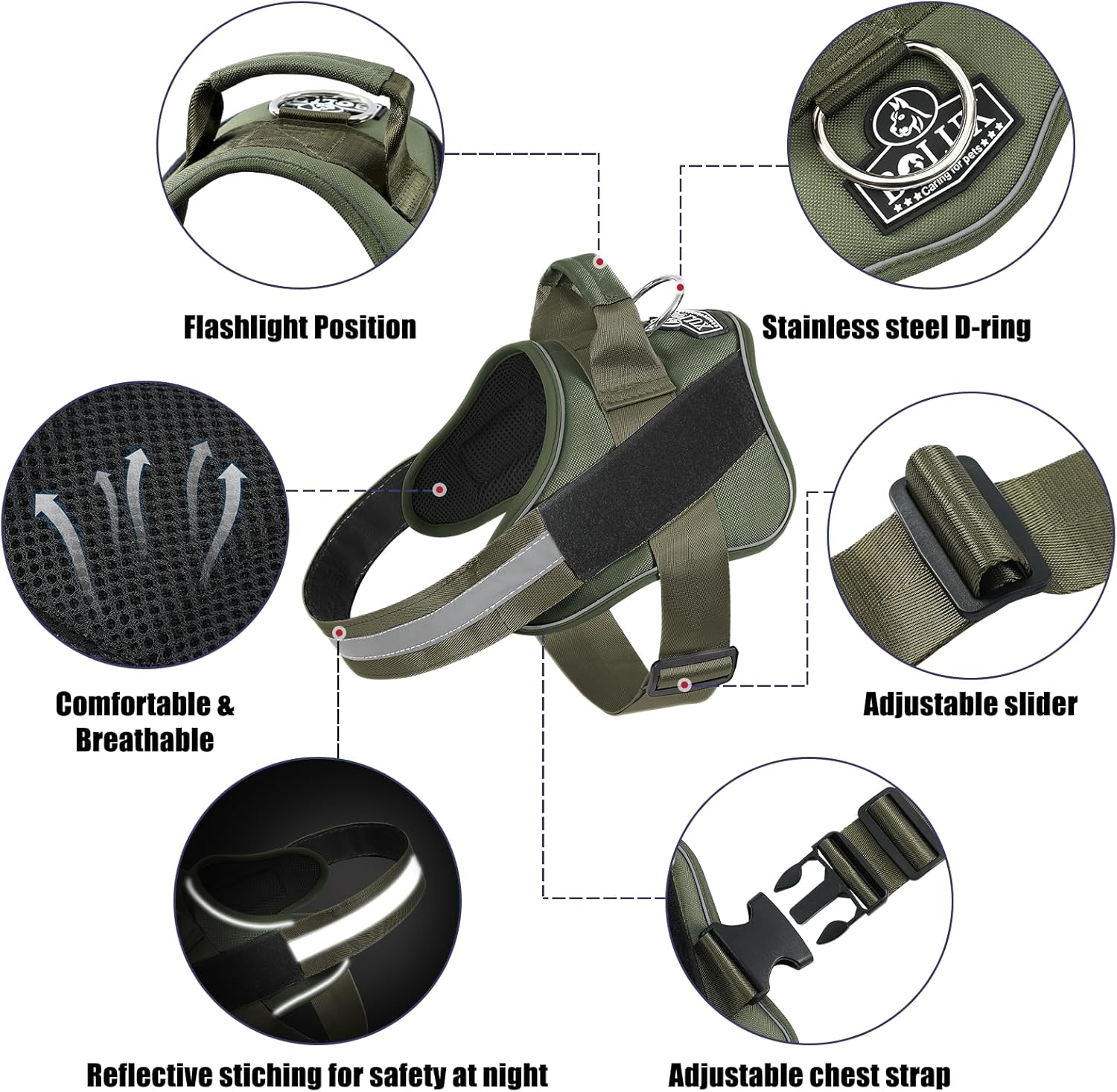 - OUTDOOR HEALTHY: Puppy no pull dog harness with reflective straps to ensure your dog is highly visible and keep dogs safe at night. You can connect the dog leash on the D-ring and with handle is easy to control on crowded streets. The high-end pet harness is perfect for daily walking, running, hiking, training, hunting, outdoor adventure and more!
