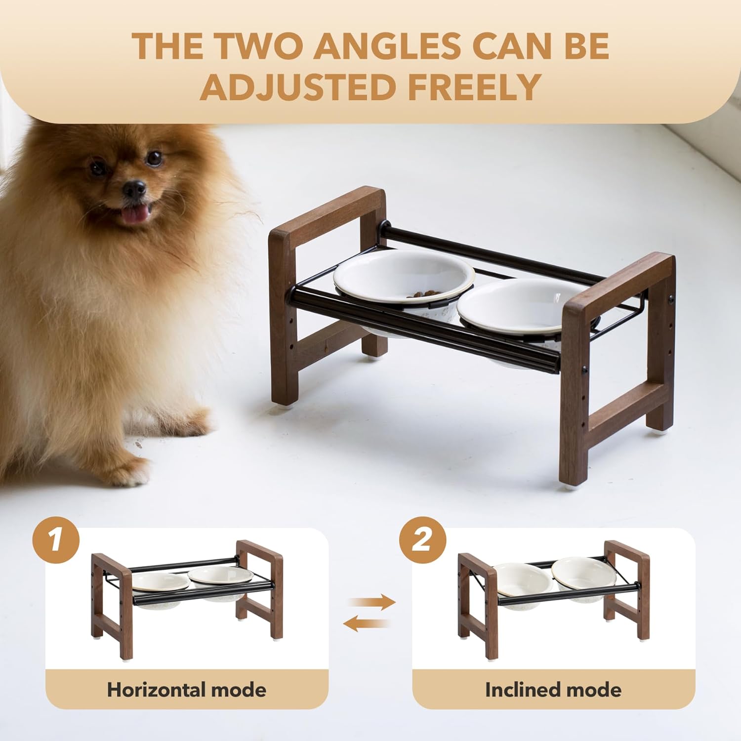 - Acacia Wood and Metal Stand: This stand combines classy acacia wood with metal rods, which is aesthetically pleasing and fits perfectly with any home decor style. Raised ceramic dog bowls provide dogs with correct eating posture, help reduce bloating and neck strain in dogs, and prevent indigestion problems.