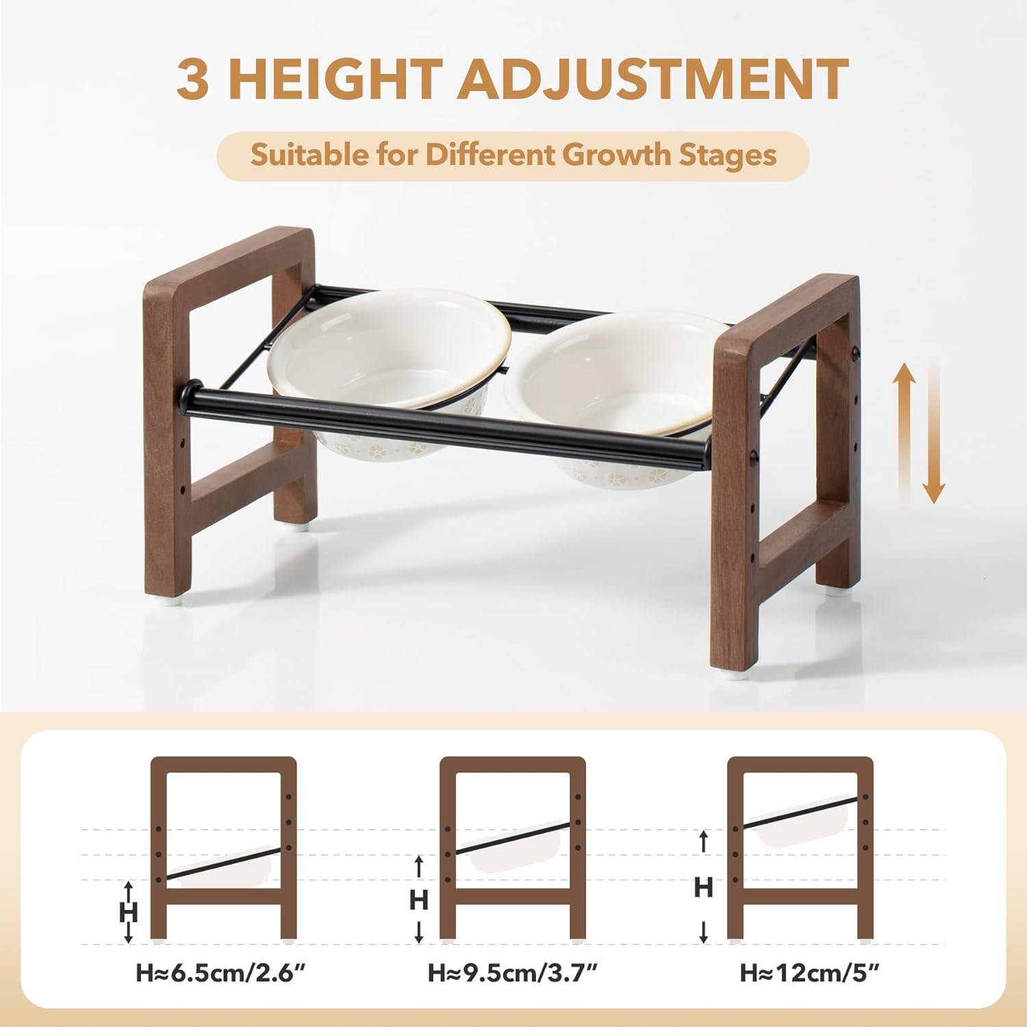 - 3 Adjustable Heights & 2 Placement Options: This stand offers 3 adjustable heights, ranging from 5.5 inches to 8.7 inches, catering to the needs of pets at different growth stages. The circular metal component on top of the stand features two distinct placement options, allowing the bowls to be either horizontally aligned or tilted. Our products are designed to help protect the pet's cervical spine and meet their diverse needs.