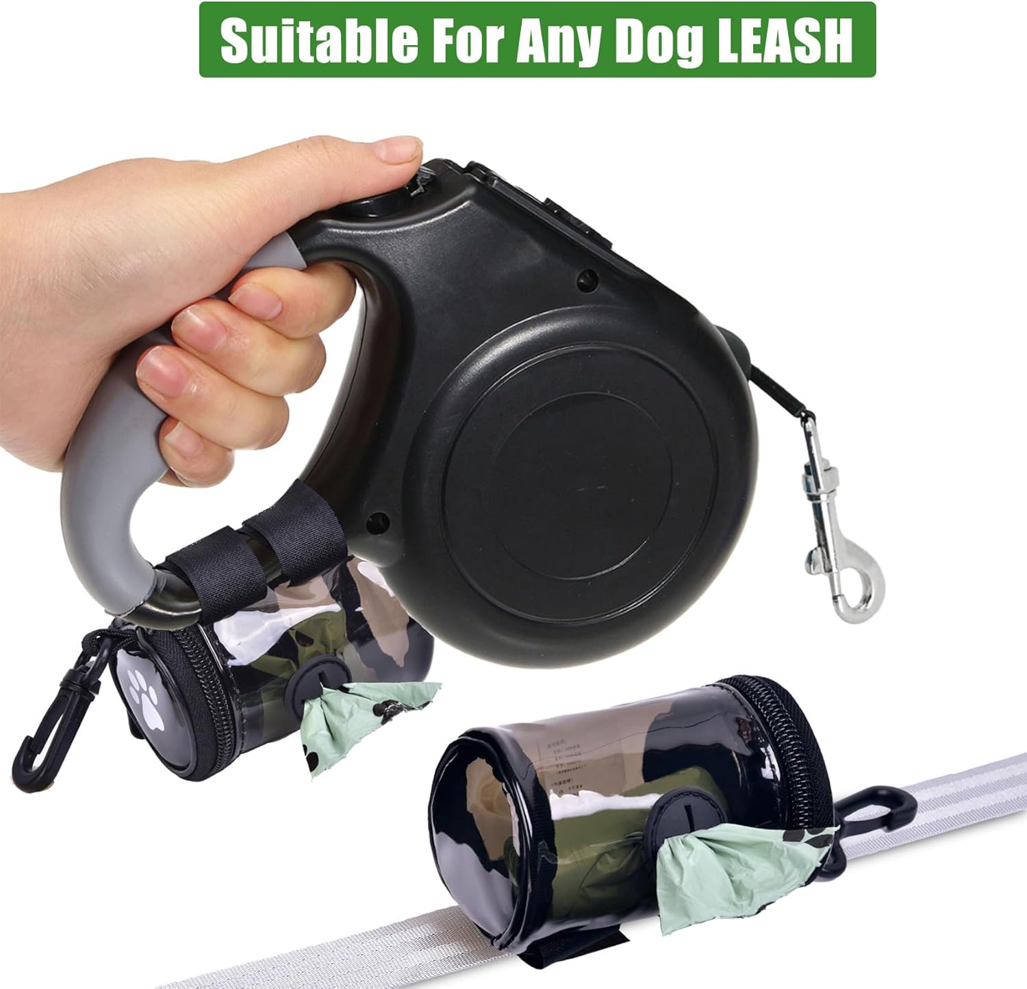 - HAND FREE WALKING SET - This practical set includes ONE Dog Poop Bag Dispensers, ONE Dog Poop Bag Holder & ONE Roll Waste Bag. A great leash attachment set for your dog walking. Enjoying hand free walking without holding wasted poop bag.