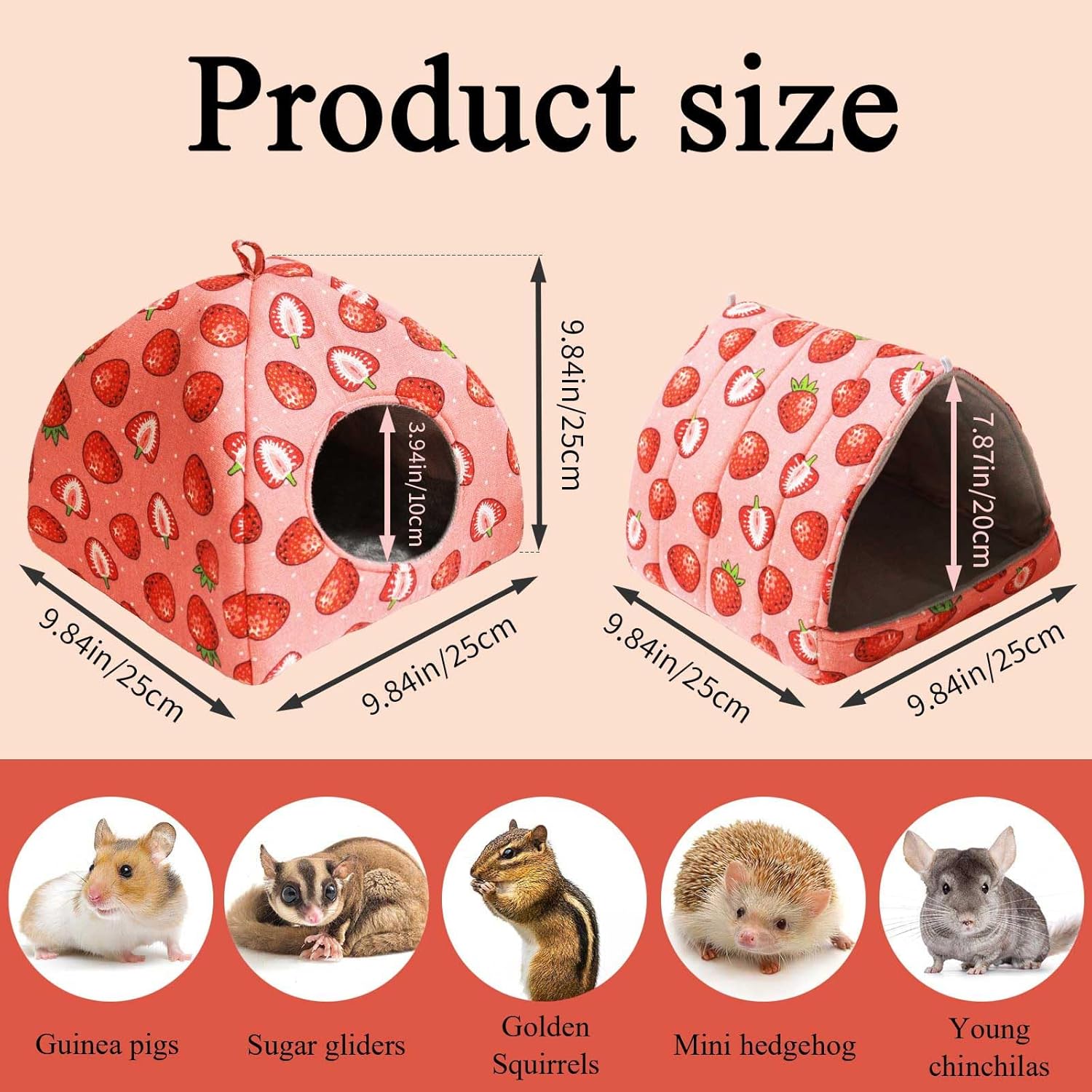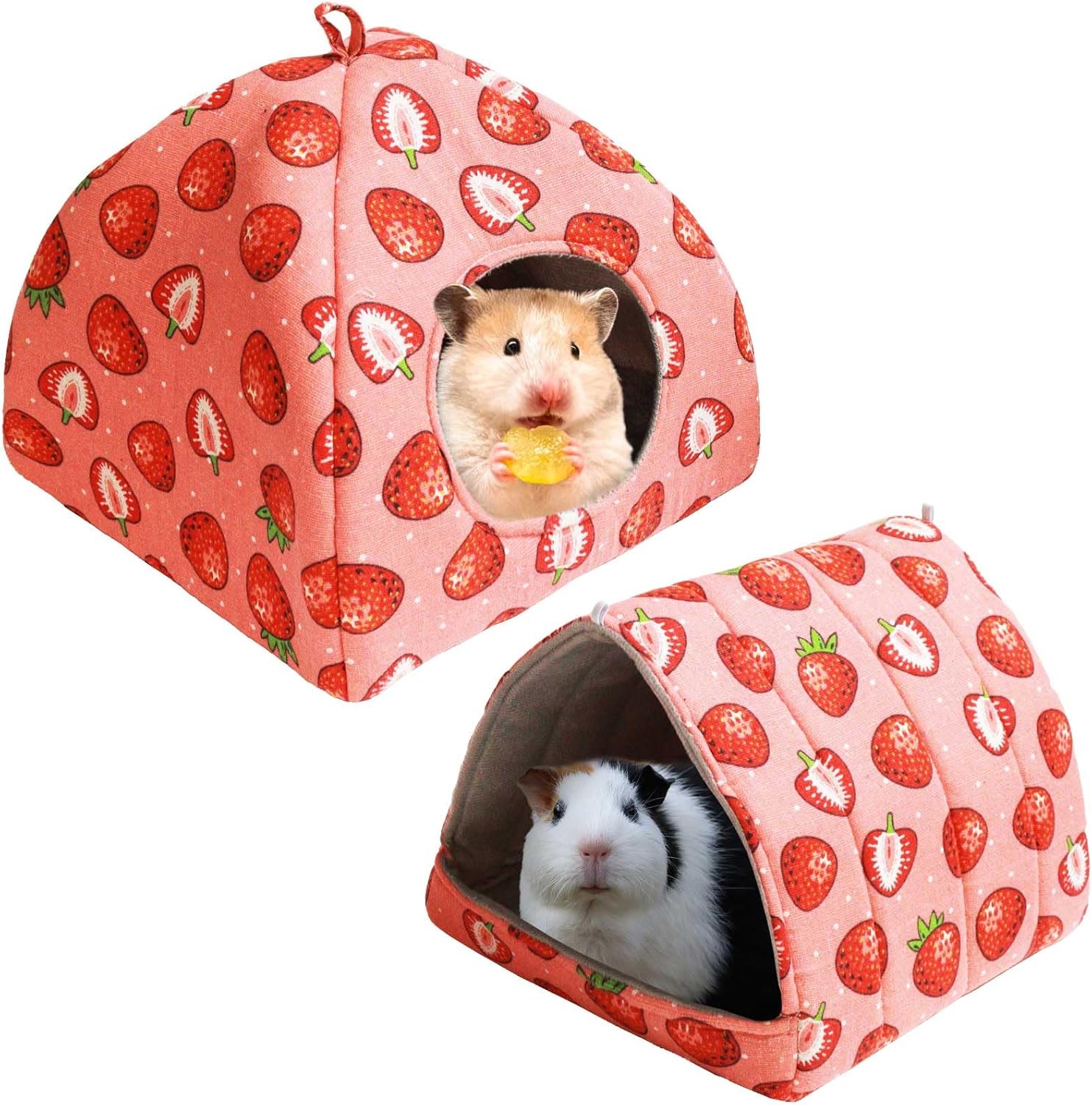 - Charming Shape Set for Versatile Comfort--This 2-piece hideout bundle includes a cozy Mongolian Tent (9.84”x9.84”x9.84”/25cm³) and a spacious Large Triangle (9.84”x9.84”x7.87”/25x25x20cm), offering pets diverse spaces to hide, nap, or explore. The playful strawberry print adds a vibrant, home-friendly aesthetic to both shapes, ensuring they complement any room or cage decor