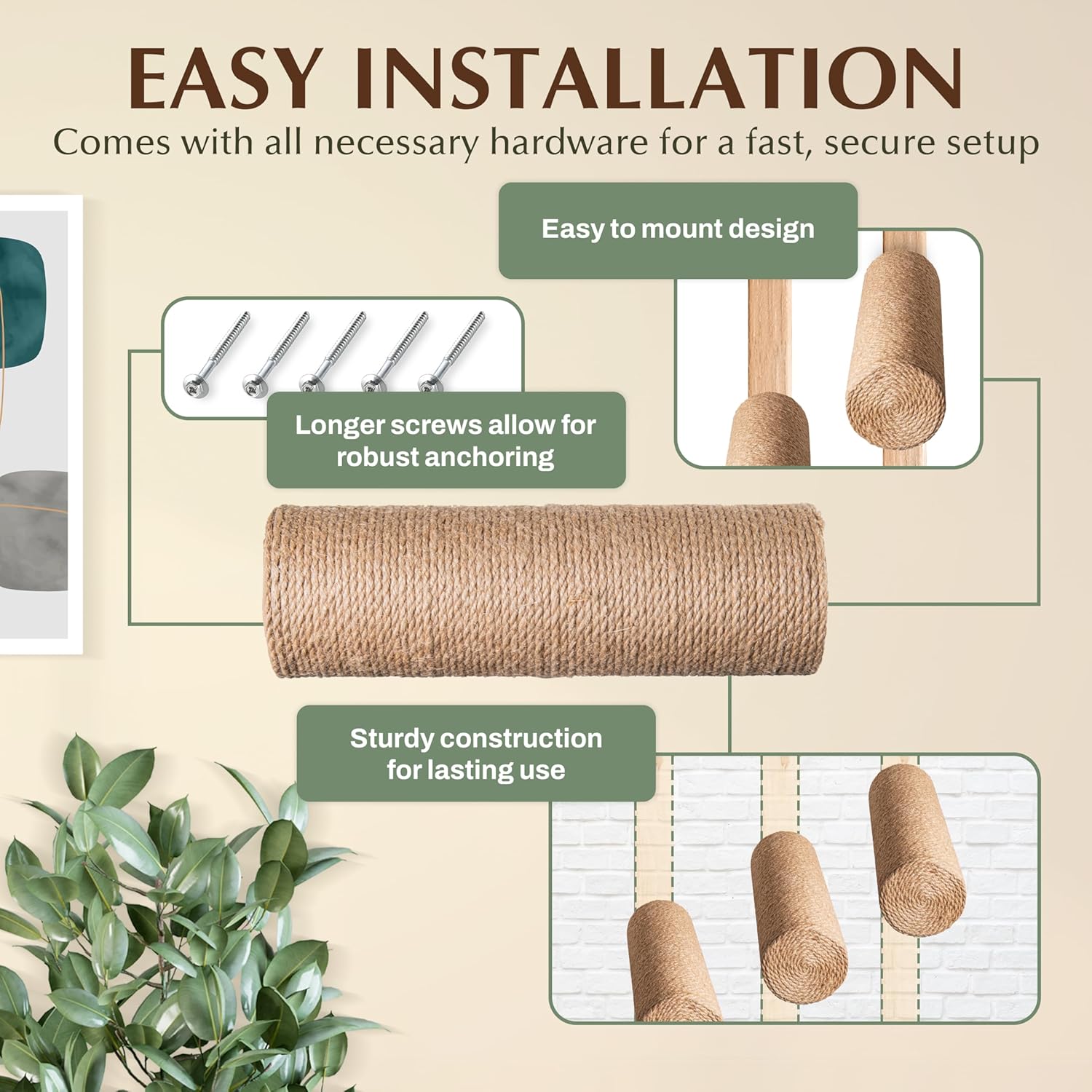 - HIDDEN MOUNTS and SISAL ROPE- Hidden mounts are a theme with our Callico Haven shelves to provide a sleek design aesthetic. The durable sisal rope also provides a safe space-efficient wall-mounted cat furniture step that supports your cat’s natural instinct to climb and scratch. This cat wall climber seamlessly blends into any home while providing endless entertainment for kittens and large cats alike.