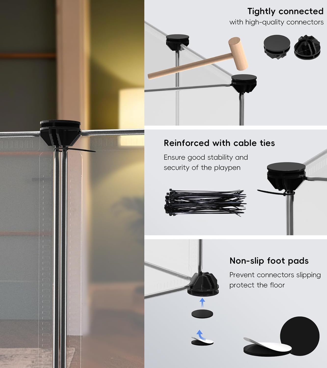 - Stability and Protection: Equipped with 42 nylon straps to securely fasten the small pet fence, and 14 anti-slip mats to prevent the fence from sliding on the floor, providing a stable play area for your pets.