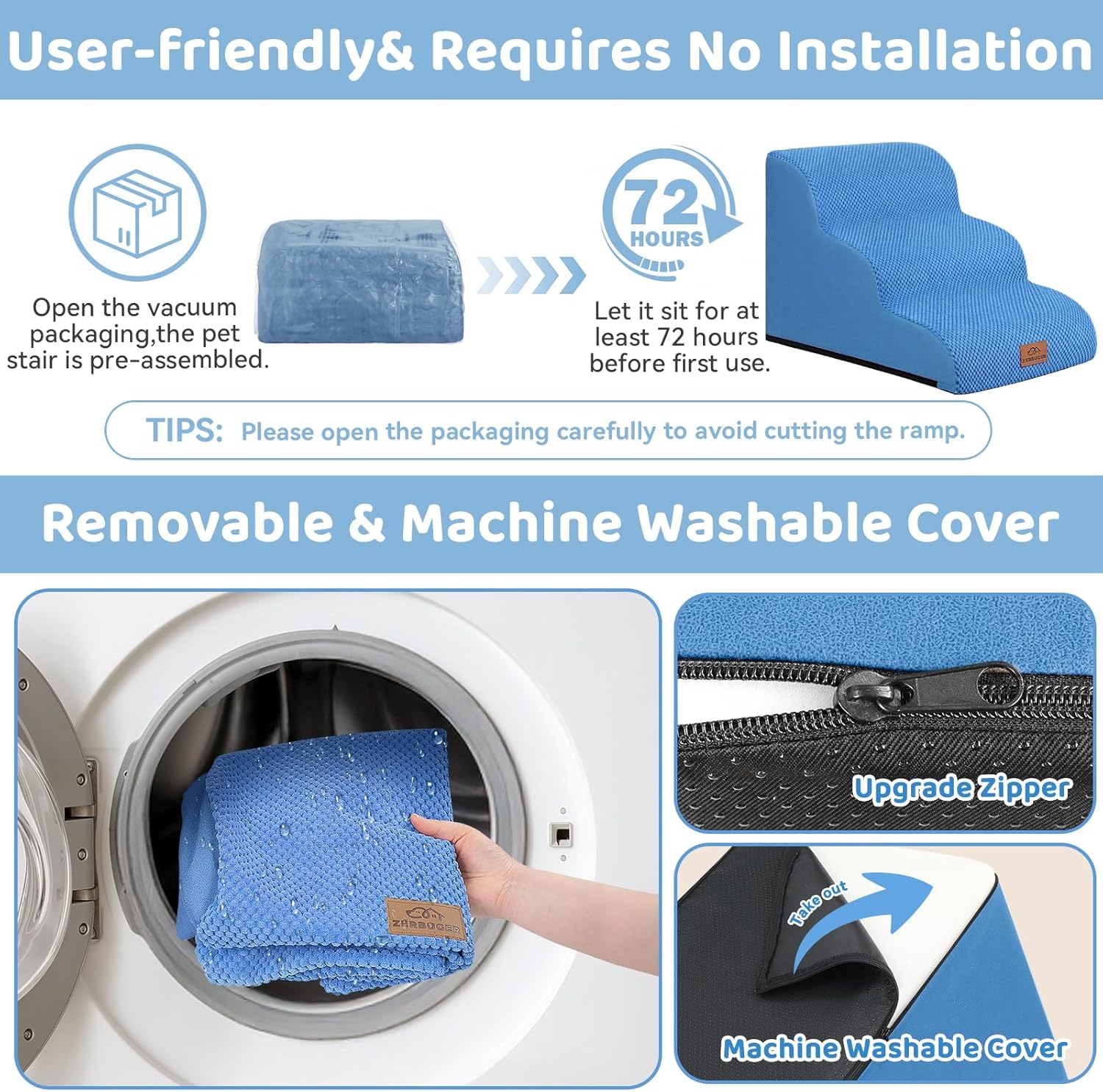 - No Assembly Required & Easy to Clean: When you open the packaging, the pet stair is already assembled. Before the first use, it should be left standing for at least 48-72 hours for the foam to fully expand. NOTE!! Open the packaging carefully to avoid cutting the stair! The outer cover can be removed for cleaning and supports machine washing or hand washing. Please note that the inner foam is not washable.