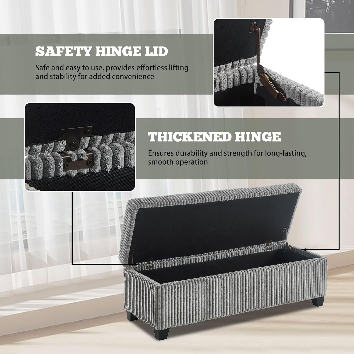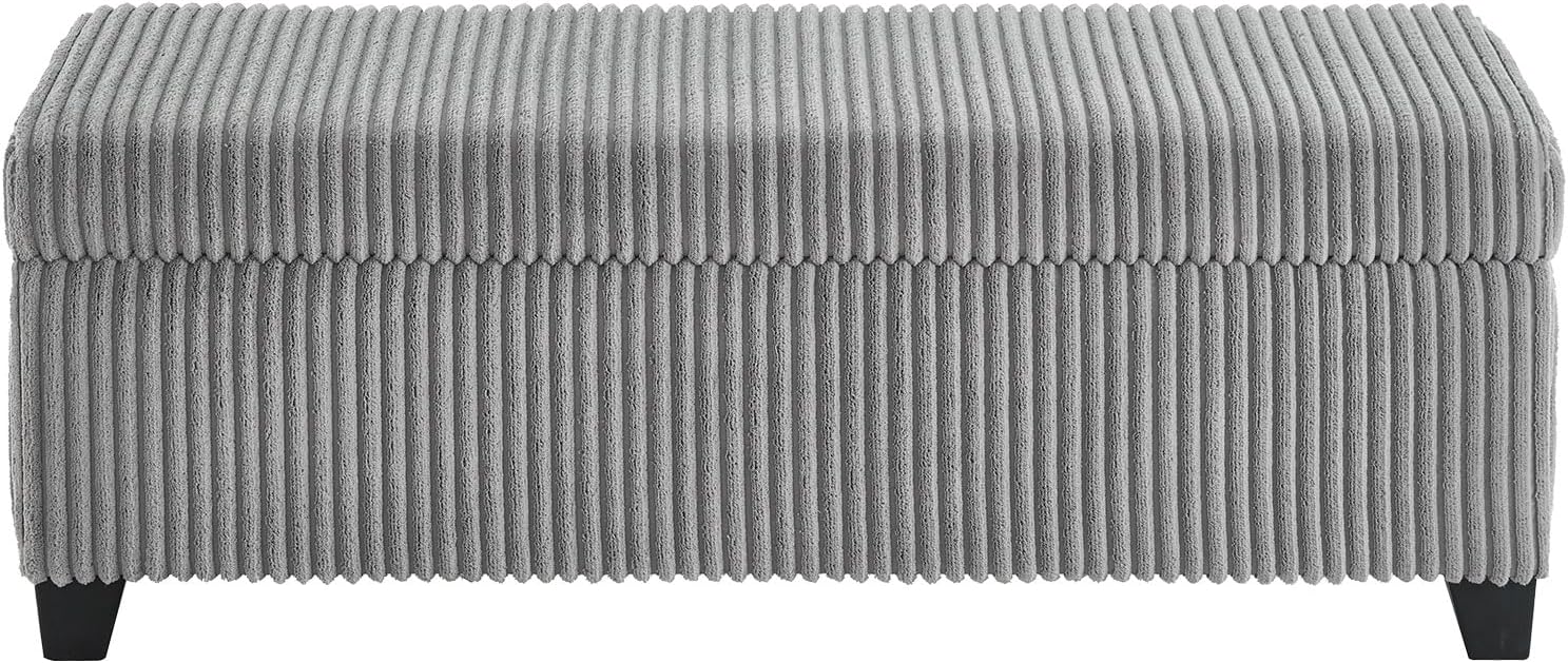 - Spacious Hidden Storage: Designed with a large interior compartment, this grey corduroy ottoman bench with storage provides ample storage space to keep blankets, books, or shoes neatly tucked away.