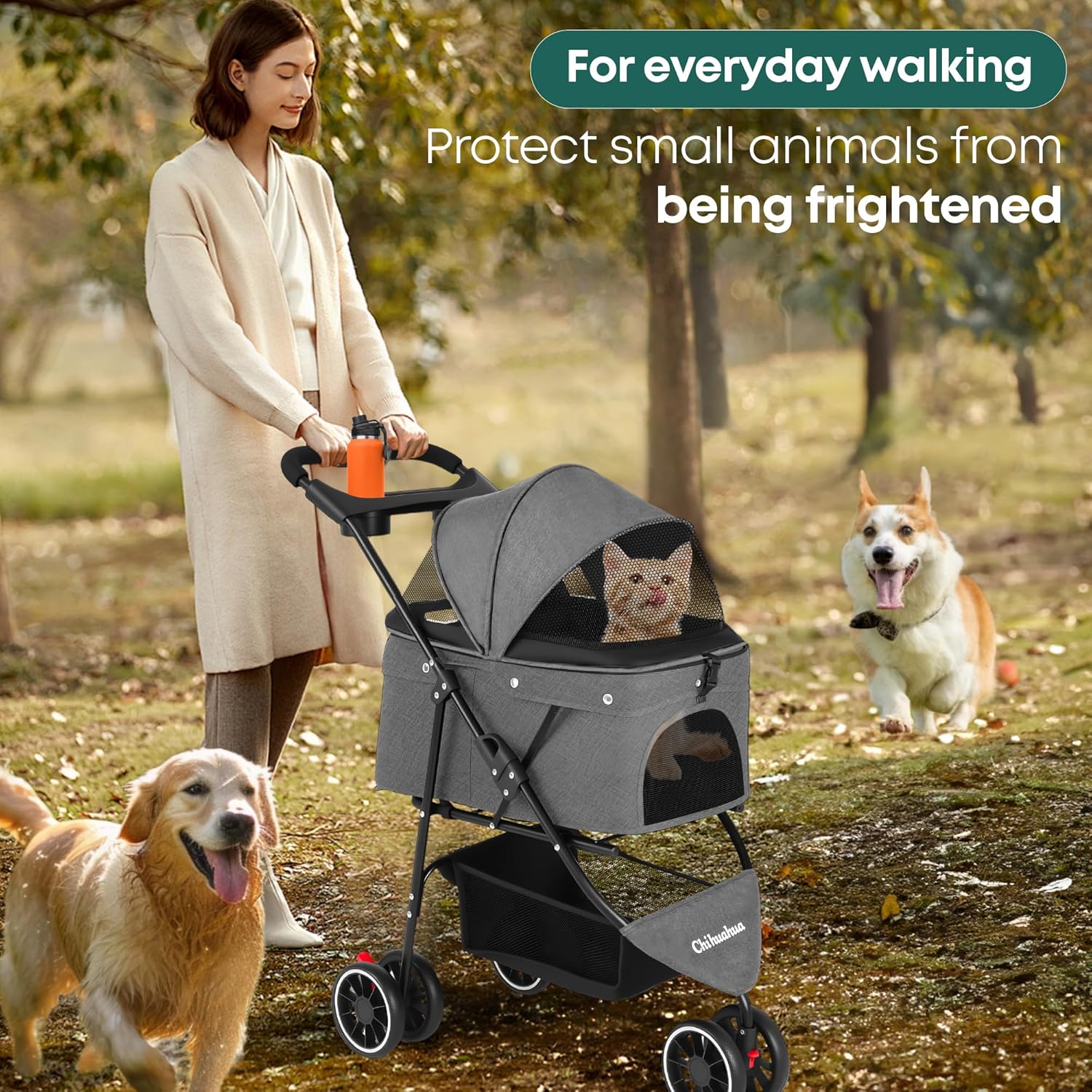 - [Breathable Mesh & Dual Access] The dog stroller has full-coverage breathable mesh allows dogs to enjoy scenic views while staying cool. Dual front/back openings let your pet face forward or interact with you, and the zipperless entry ensures hassle-free access