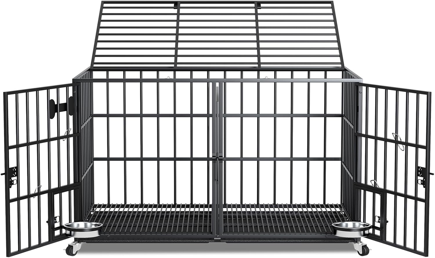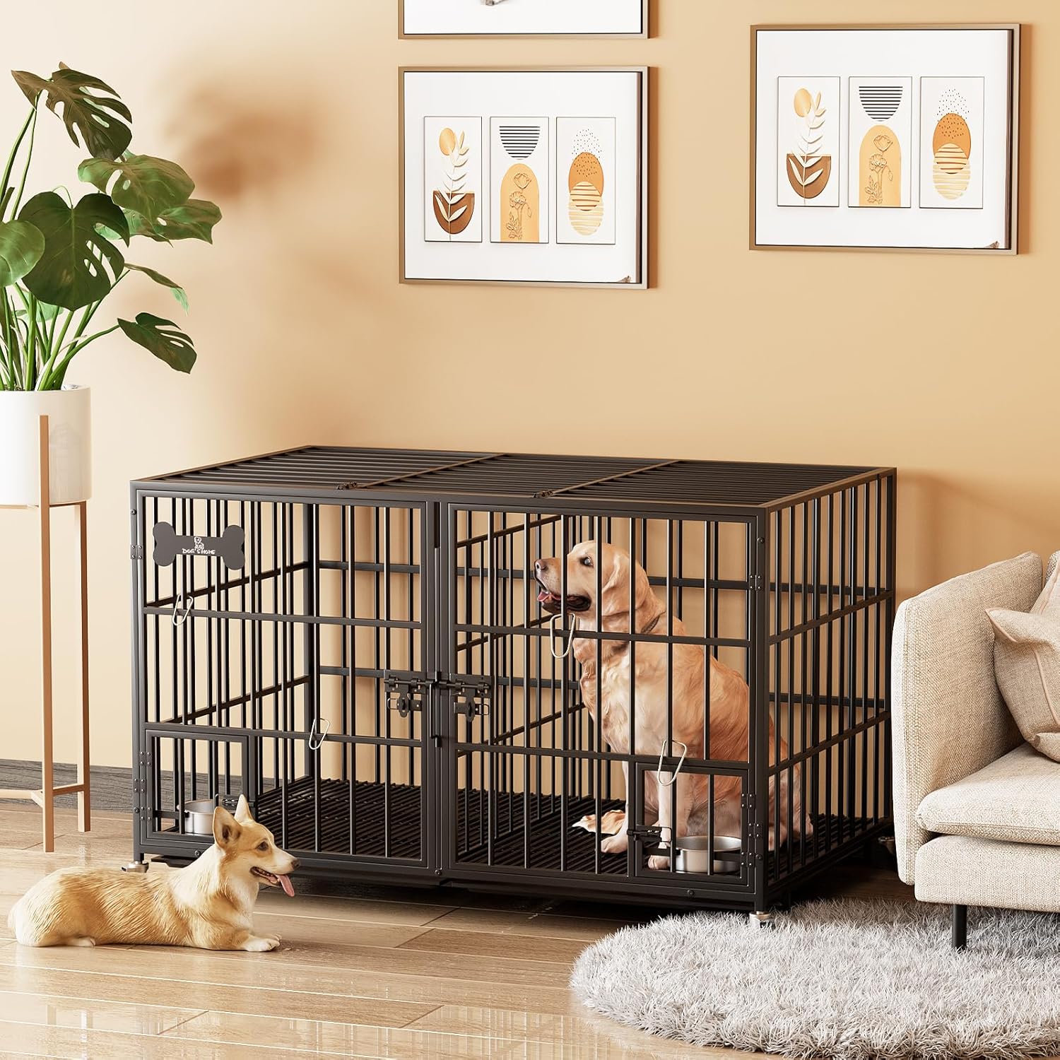 54 inch XL Dog Crate for Large Dog/Double Medium Dogs,Heavy Duty Metal Dog Cages,All Metal Open Top,Dog Kennel Indoor with Wheels,Floor Grid, Tray, Divider and Feeding Bowl