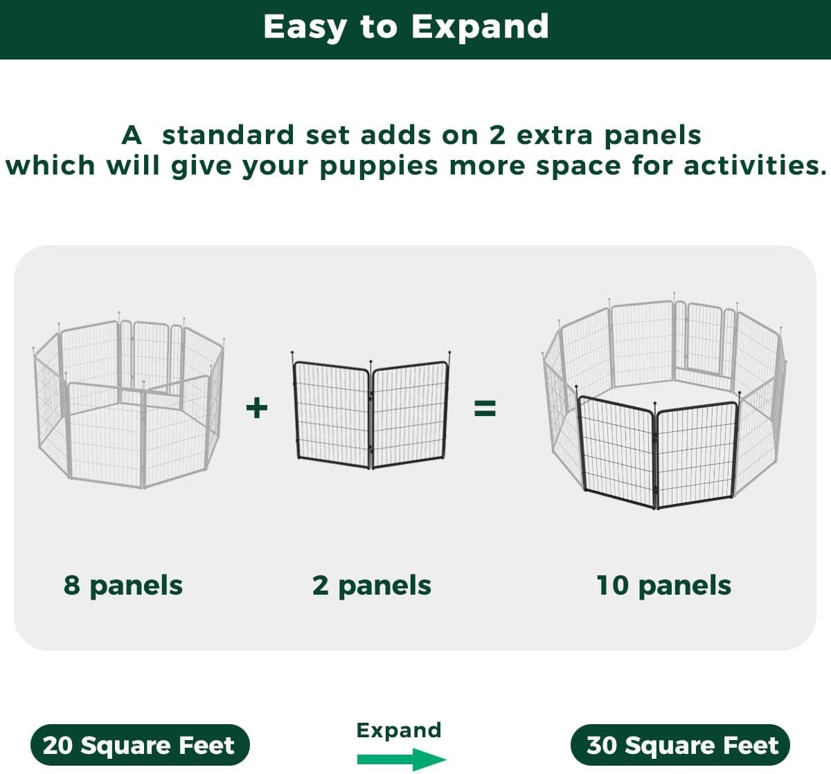 - Super easy to assemble: It won’t take you more than 5 minutes to assemble these portable dog fences as well as pack them away due to the rod-connected design. Meanwhile, panels can be added or removed freely to give you a fully flexible area and arrange the dog pen in any shape you need.